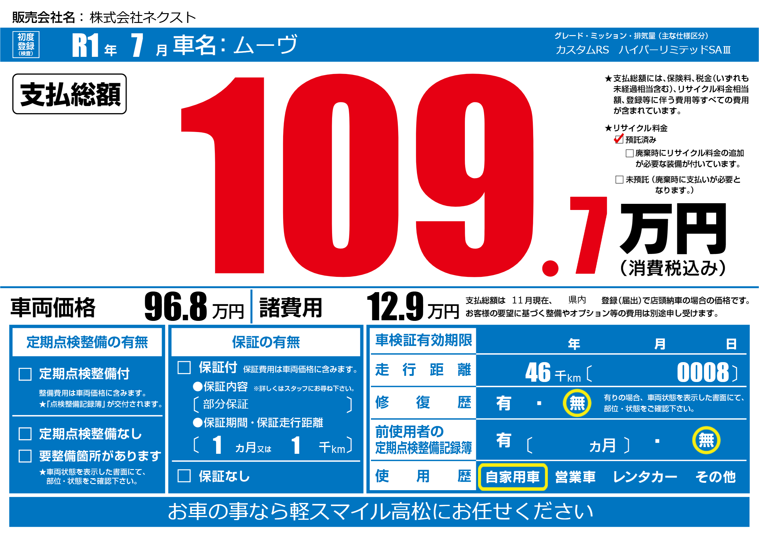 | 車名 | ムーヴ | グレード ミッション 排気量 |
