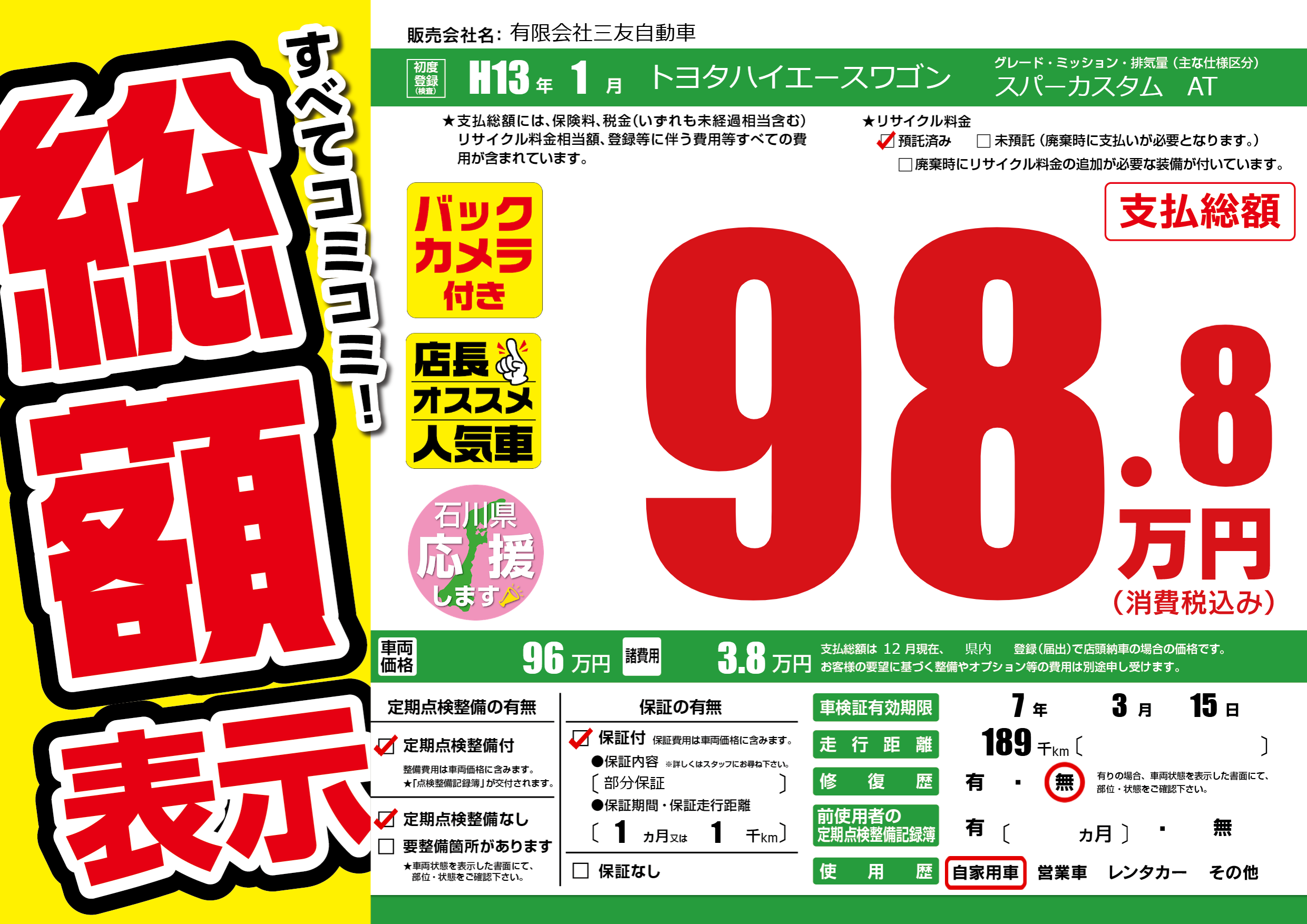 | 車名 | トヨタハイエースワゴン | グレード ミッション 排気量 |