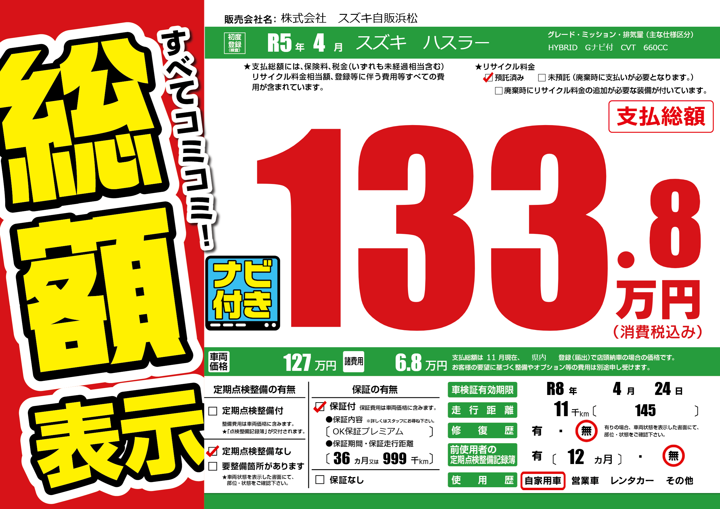 | 車名 | スズキ ハスラー | グレード ミッション 排気量 |