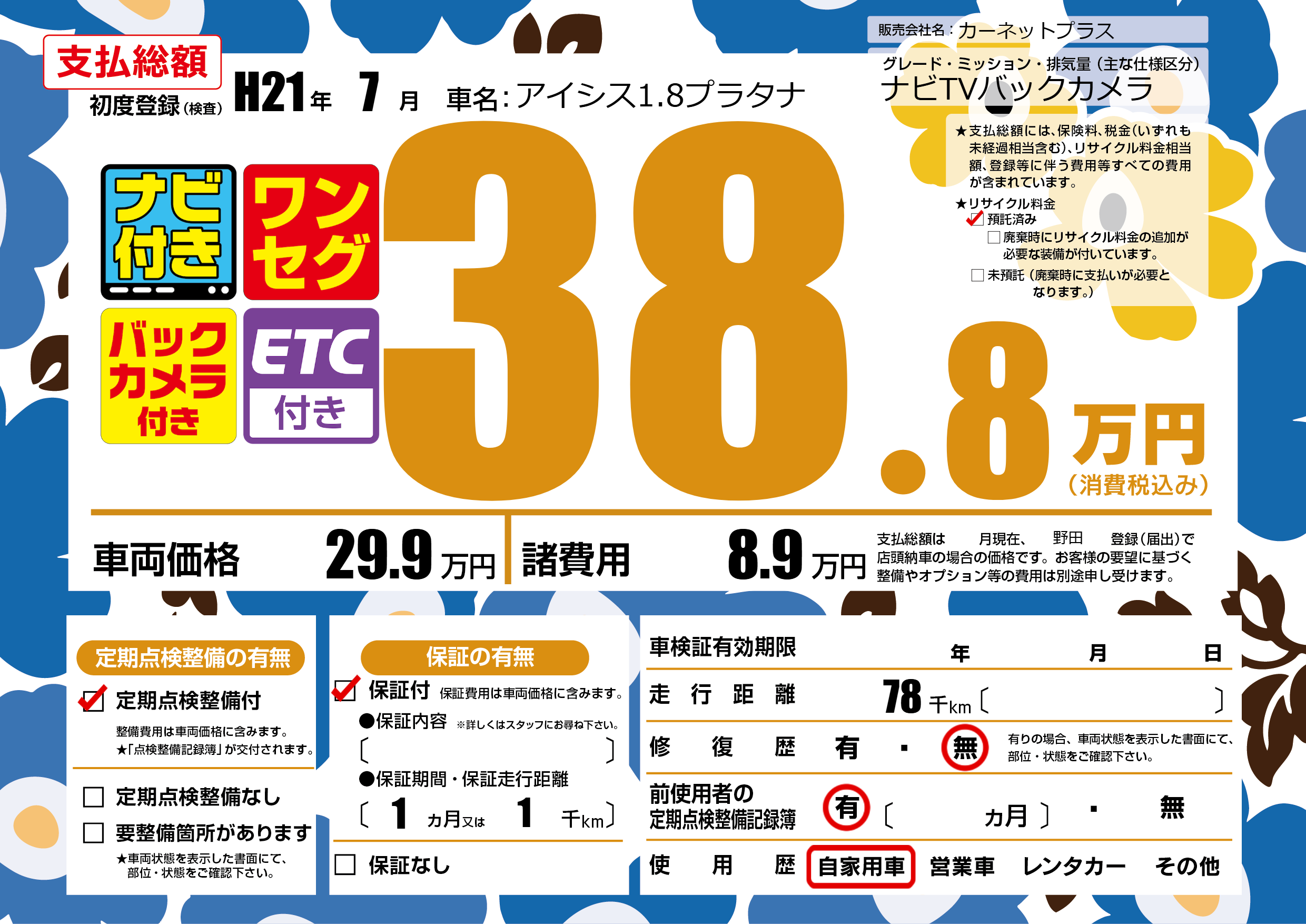 | 走行キロ | 7.8万km | 初年度登録 | H21年7月 |