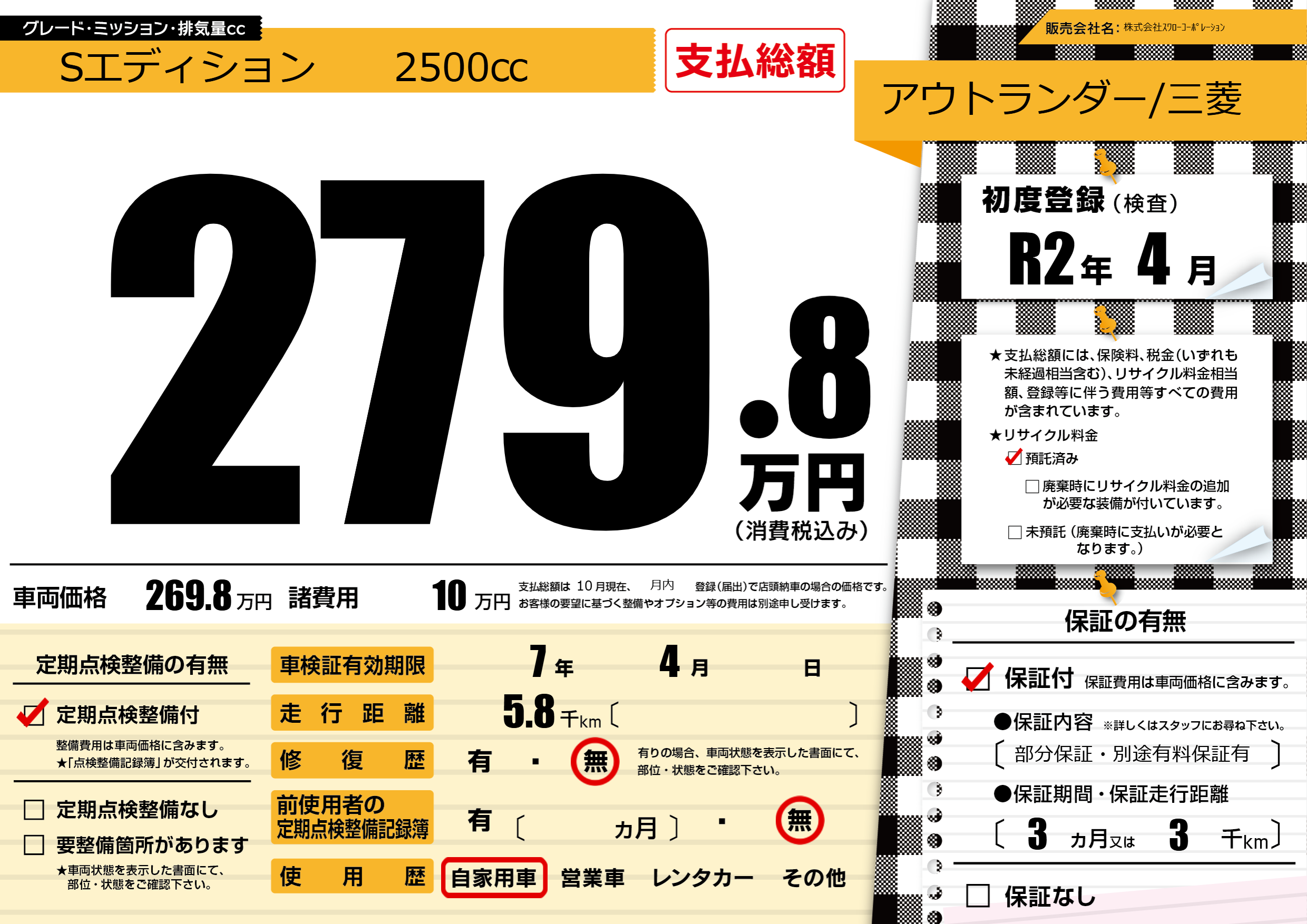 保証付き 保証内容(部分保証・別途有料保証有) 3ヶ月または(3)千kmまで |