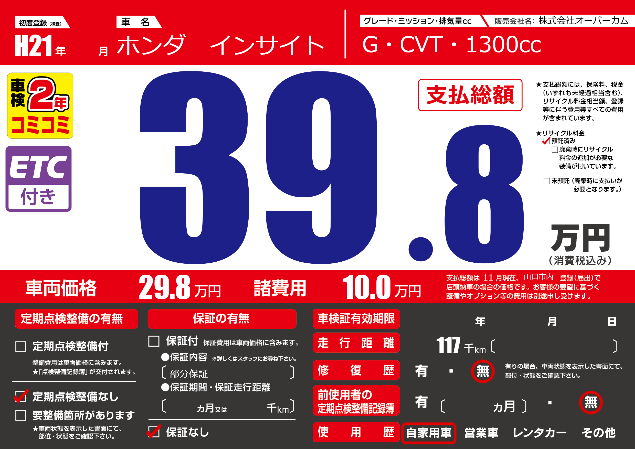 | 車名 | ホンダ インサイト | グレード ミッション 排気量 |