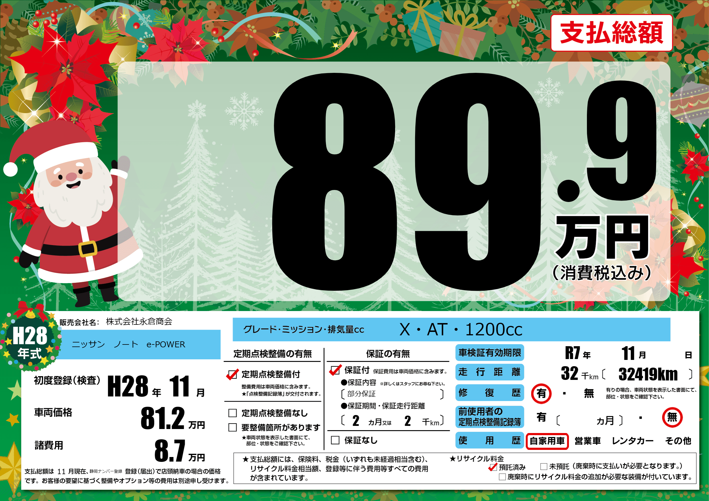 | 車名 | ニッサン ノート e-POWER | グレード ミッション 排気量 |