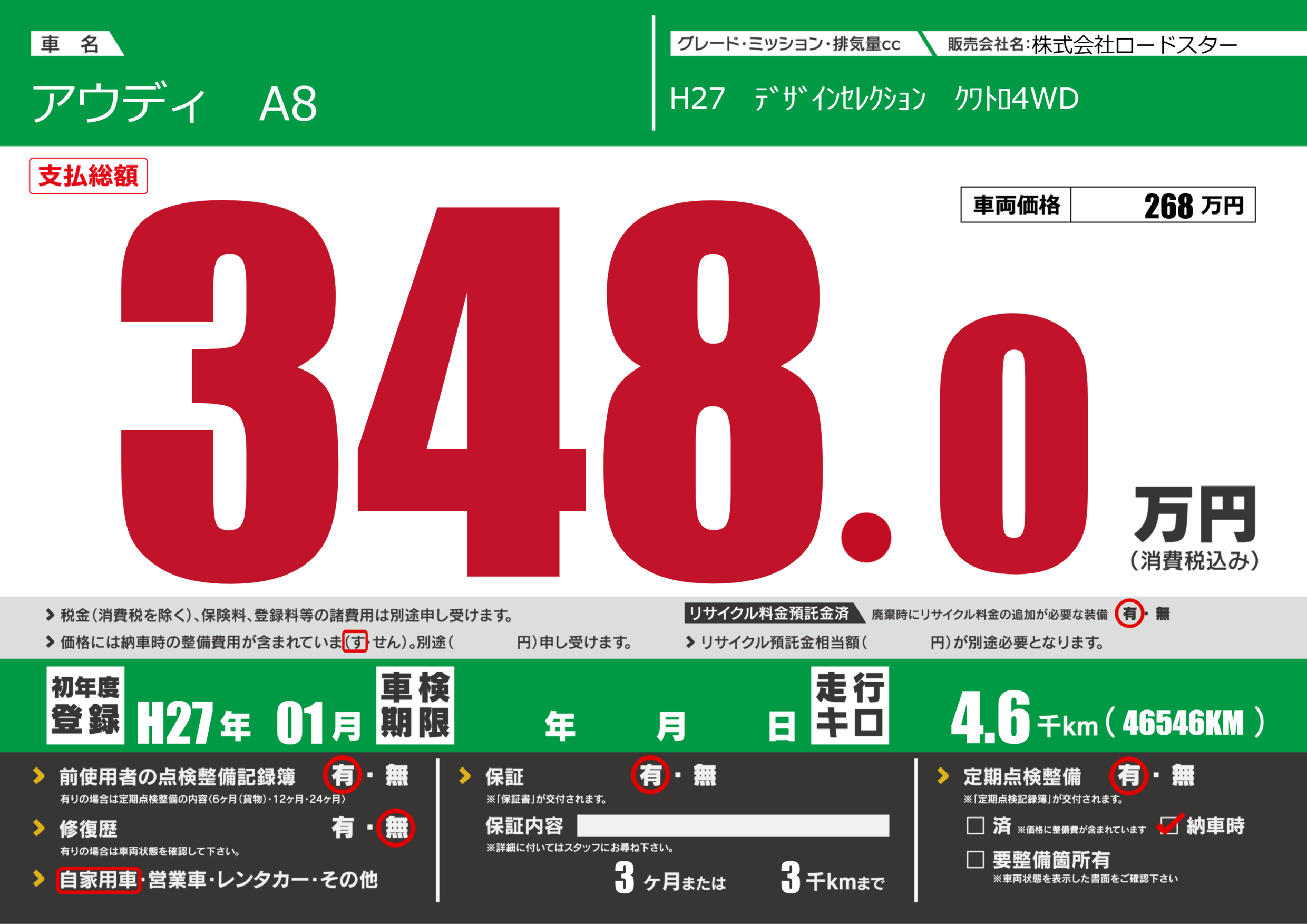 保証付き 保証内容(---) 3ヶ月または(3)千kmまで |