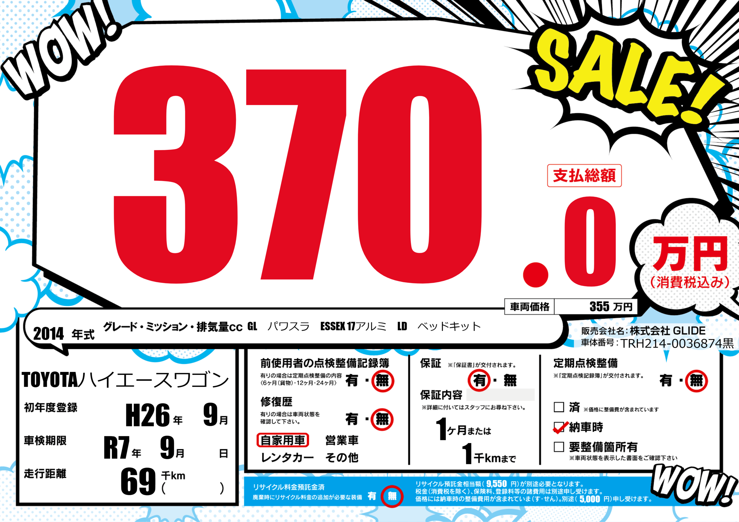| 車名 | TOYOTAハイエースワゴン | グレード ミッション 排気量 |