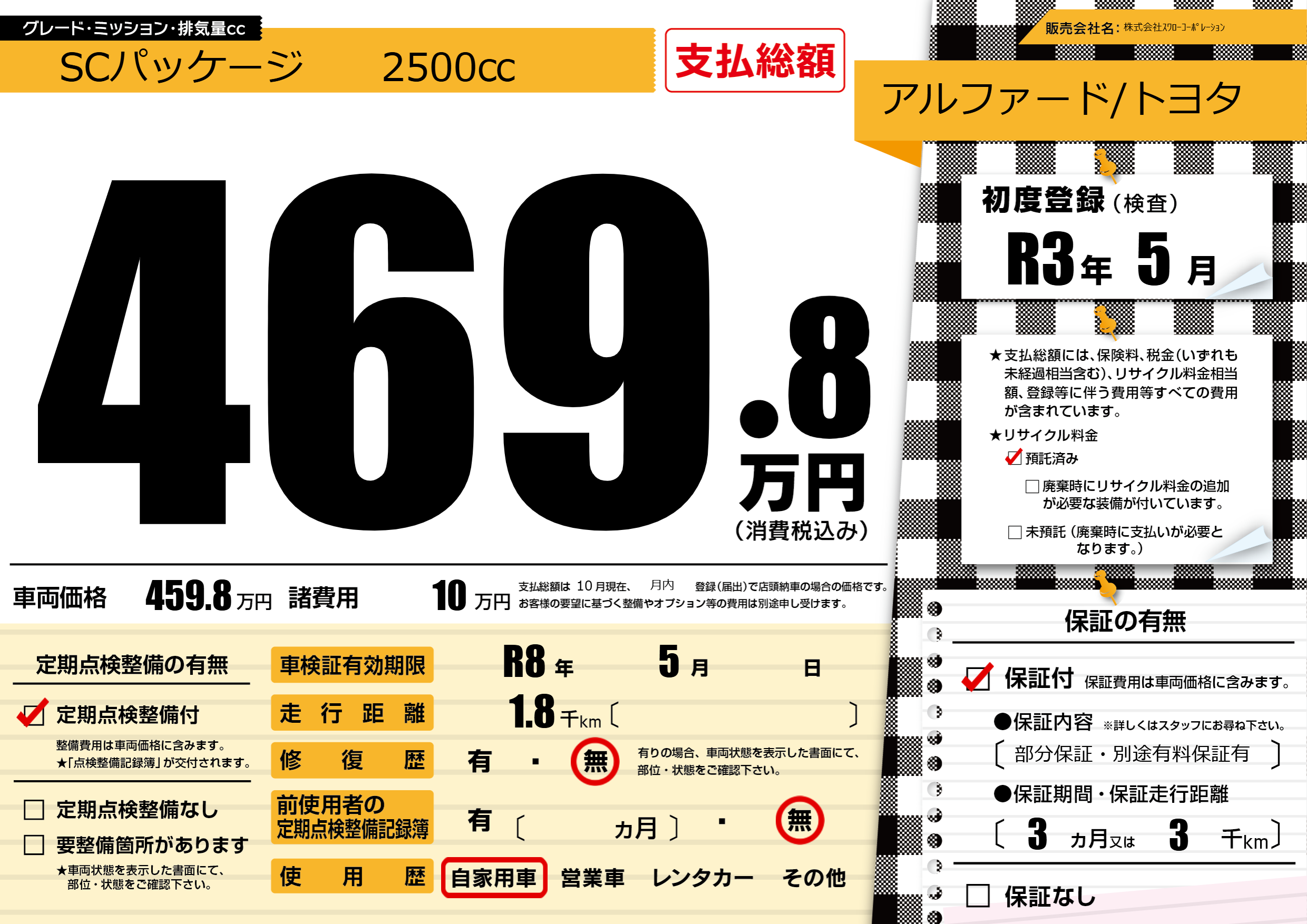 | 車名 | アルファード/トヨタ | グレード ミッション 排気量 |