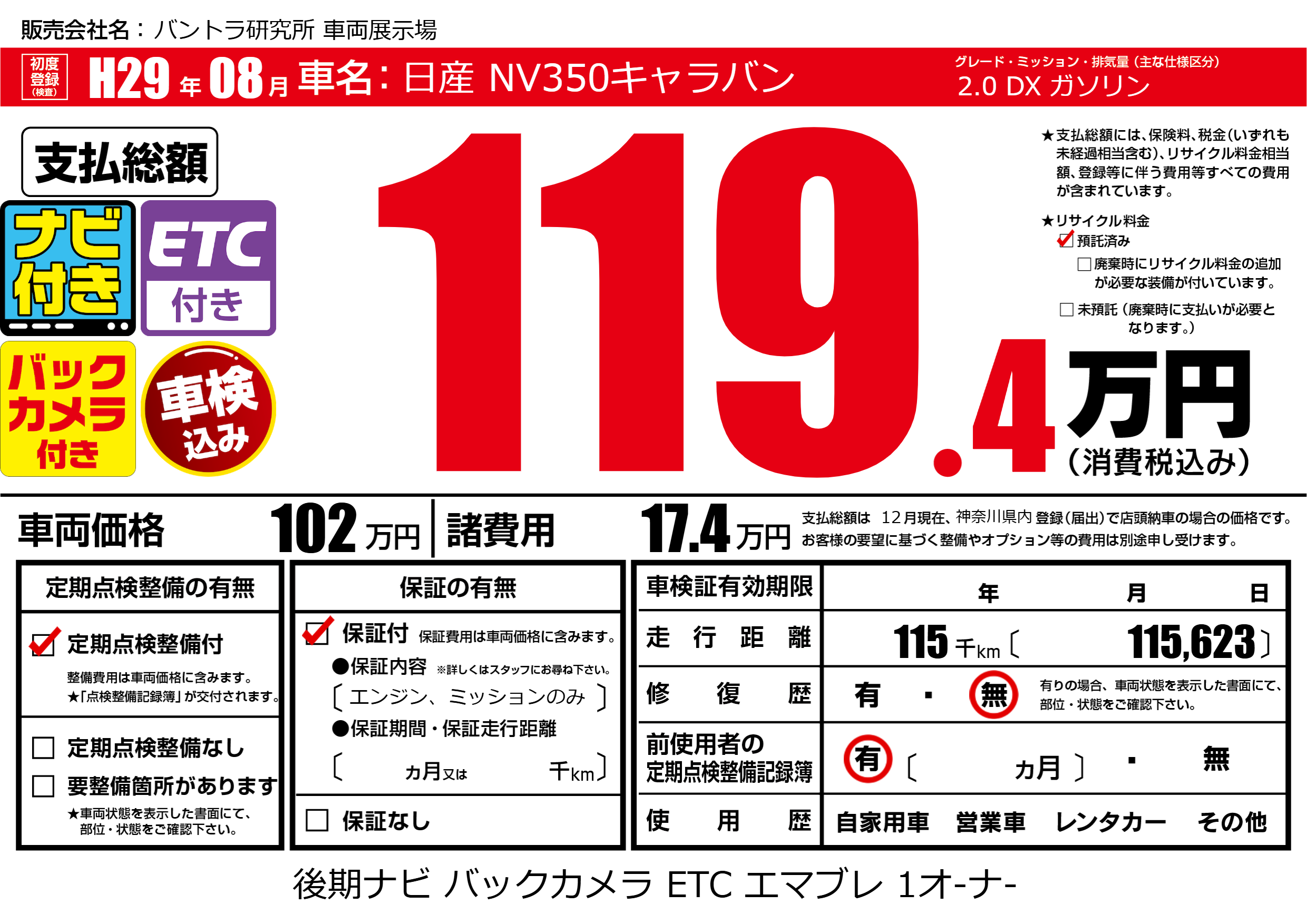 | 車名 | 日産 NV350キャラバン | グレード ミッション 排気量 |