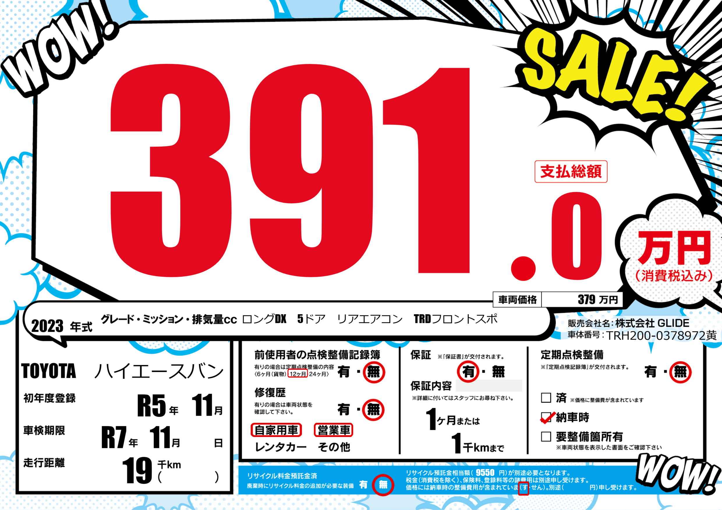 | 車名 | TOYOTA ハイエースバン | グレード ミッション 排気量 |