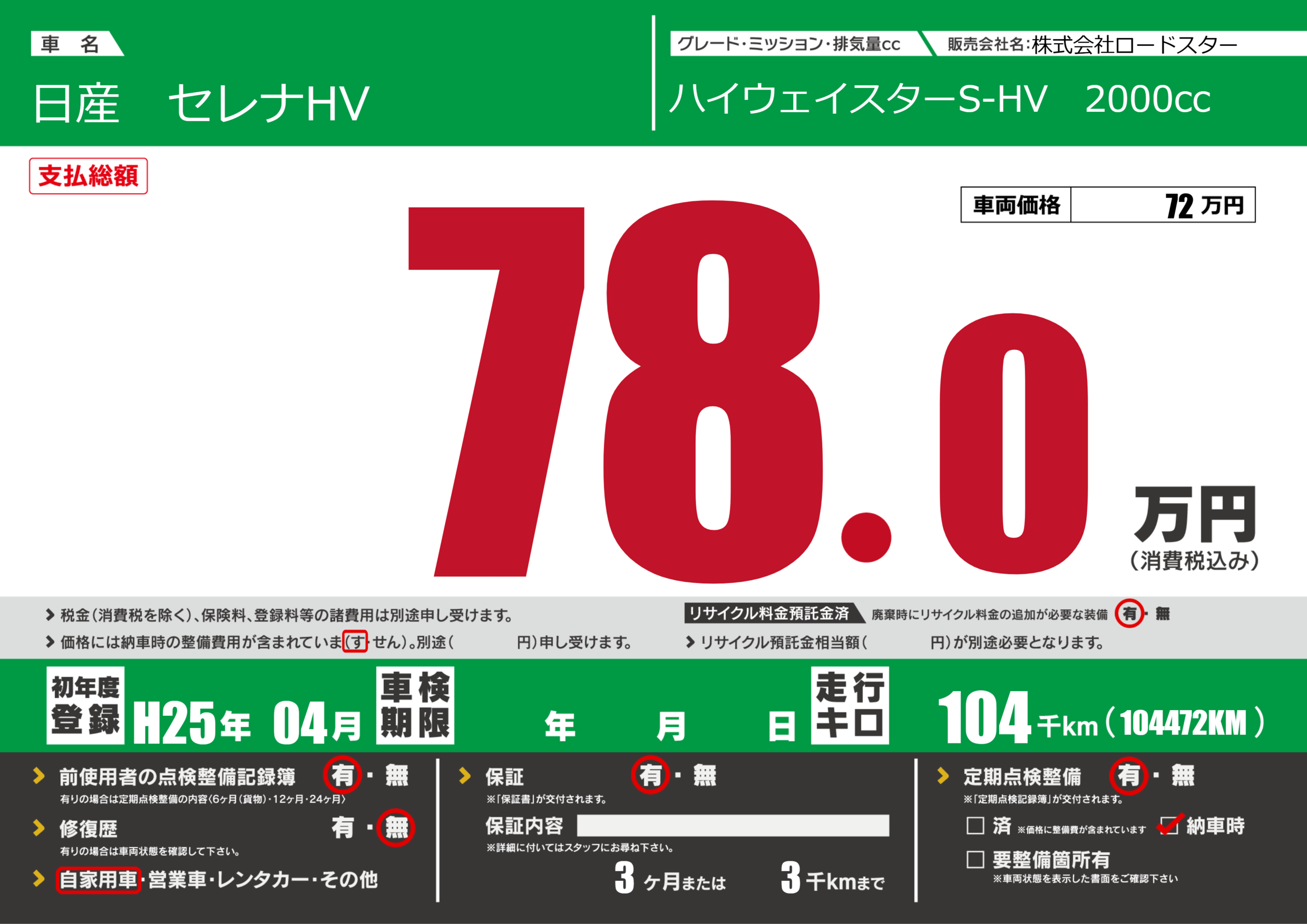 保証付き 保証内容(---) 3ヶ月または(3)千kmまで |