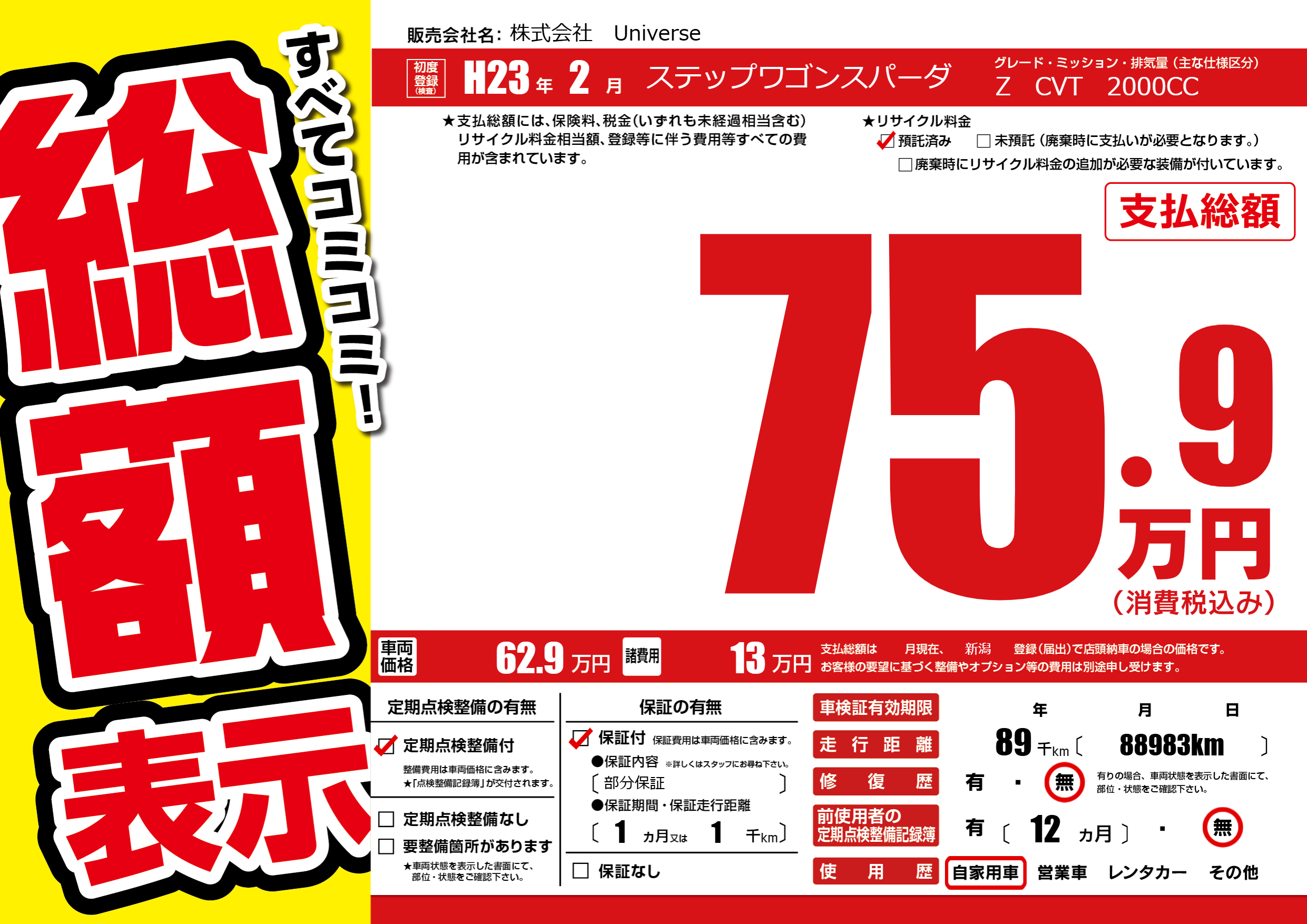 | 走行キロ | 8.9万km | 初年度登録 | H23年2月 |