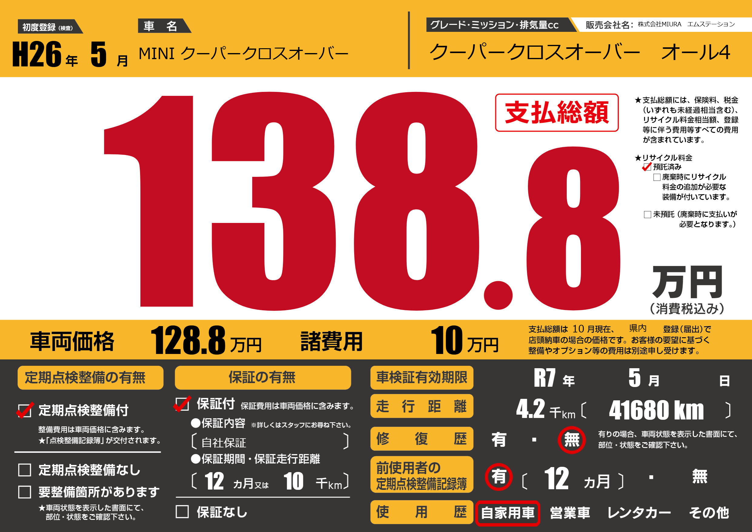 | 車名 | MINI クーパークロスオーバー | グレード ミッション 排気量 |