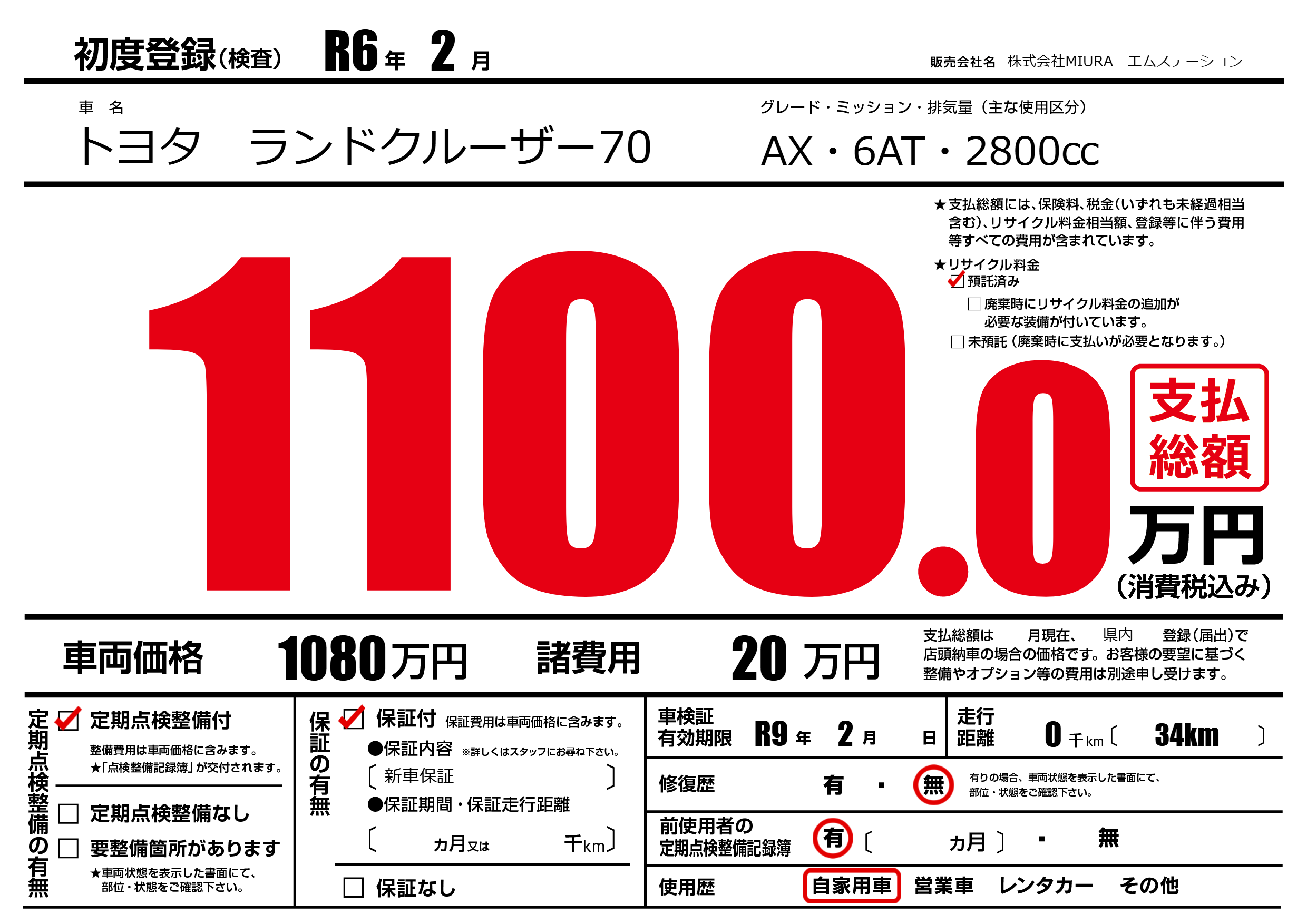 | 車名 | トヨタ ランドクルーザー70 | グレード ミッション 排気量 |