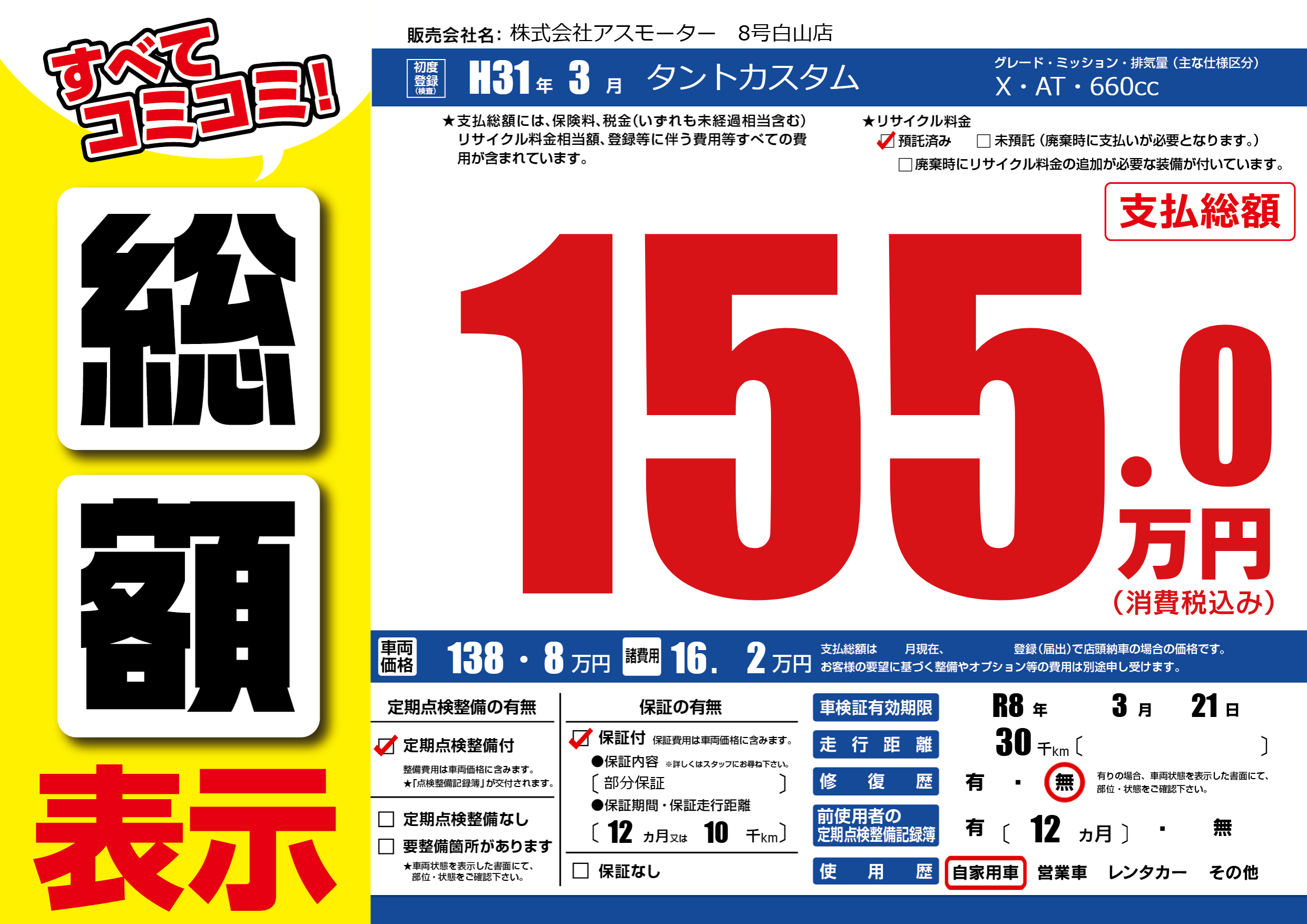 | 車名 | タントカスタム | グレード ミッション 排気量 |
