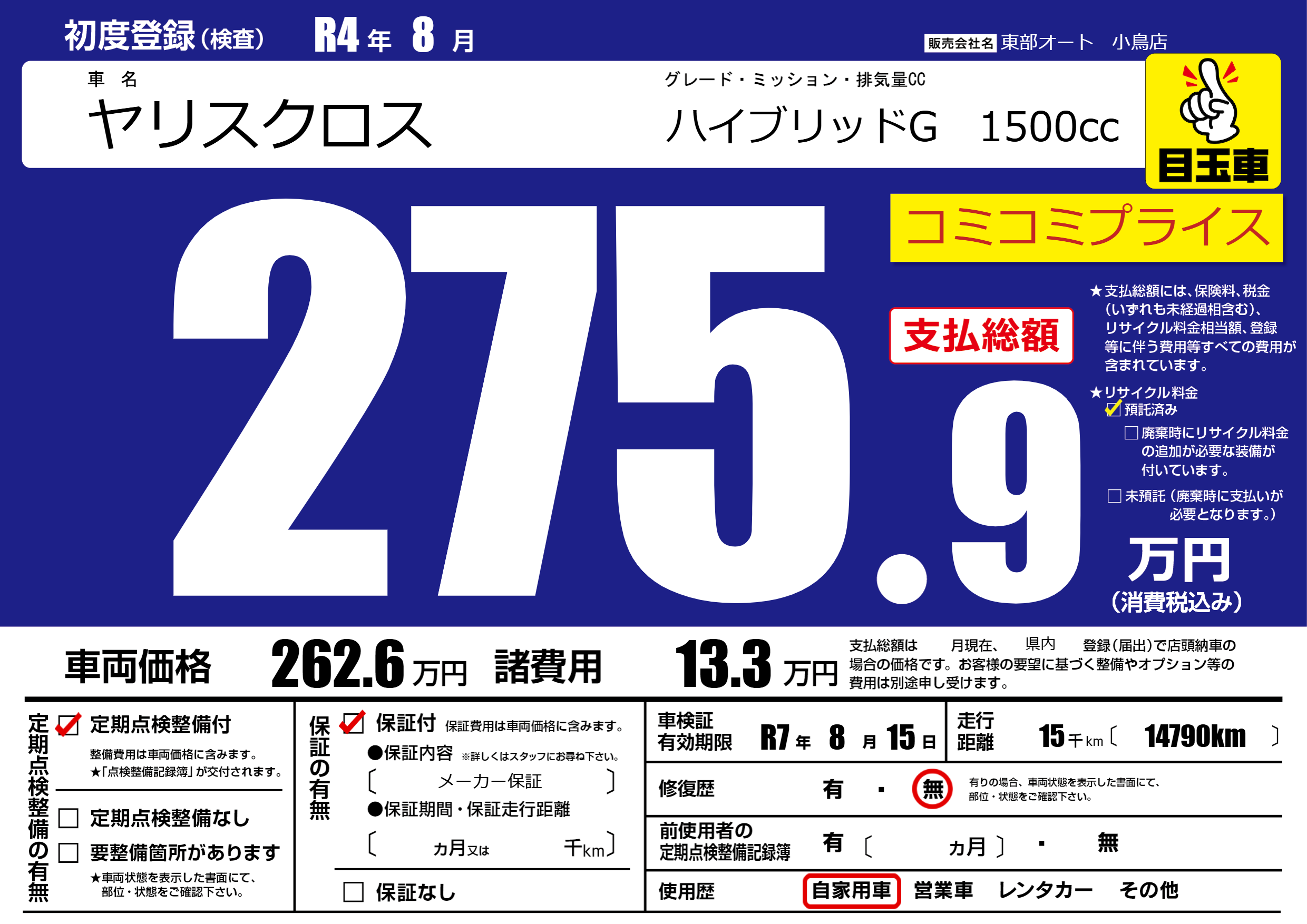 | 車検制限 | R7年 8月 15日 | ||