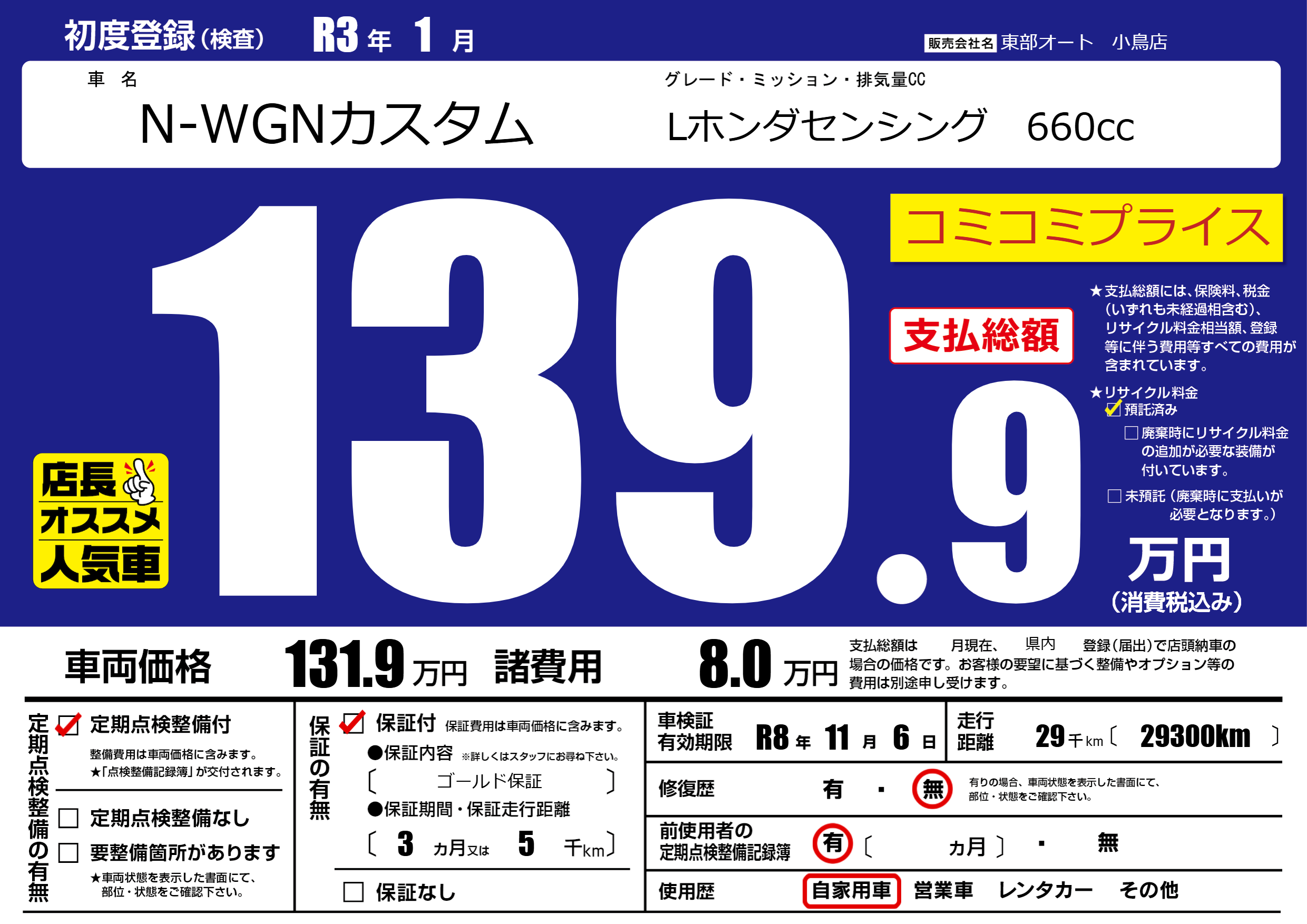 | 車検制限 | R8年 11月 6日 | ||