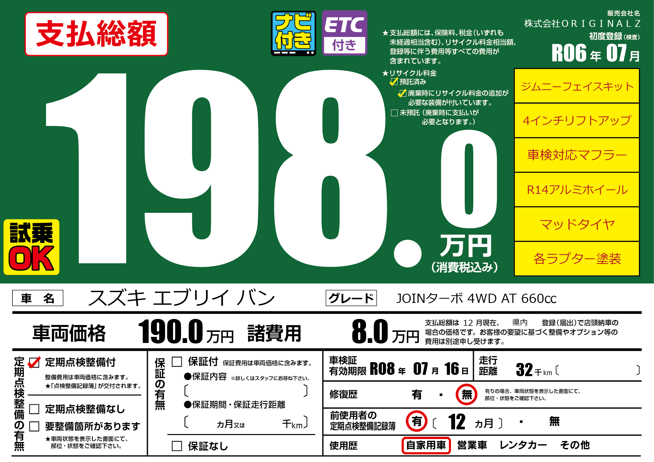 | 車名 | スズキ エブリイ バン | グレード ミッション 排気量 |