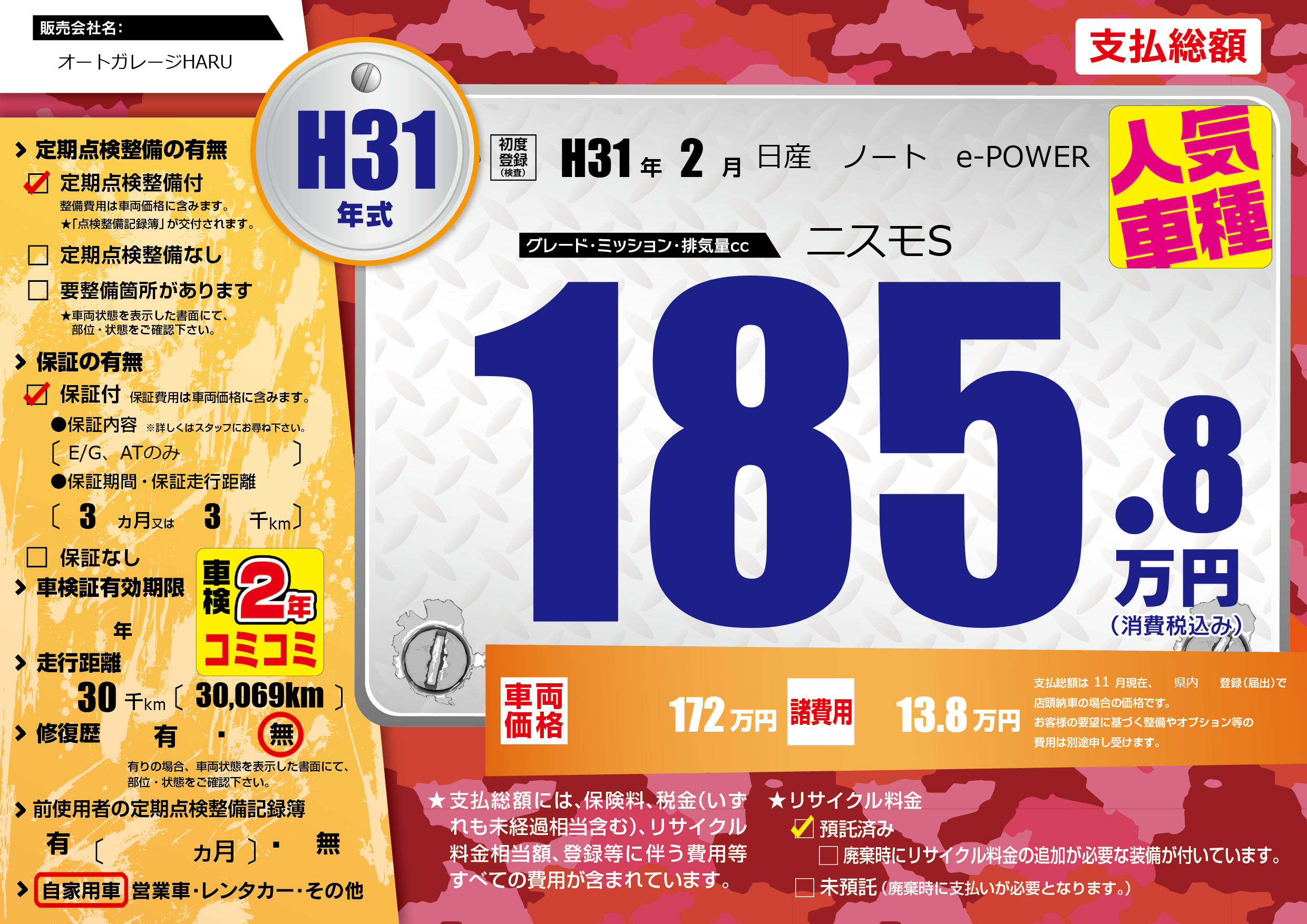 | 車名 | 日産 ノート e-POWER | グレード ミッション 排気量 |