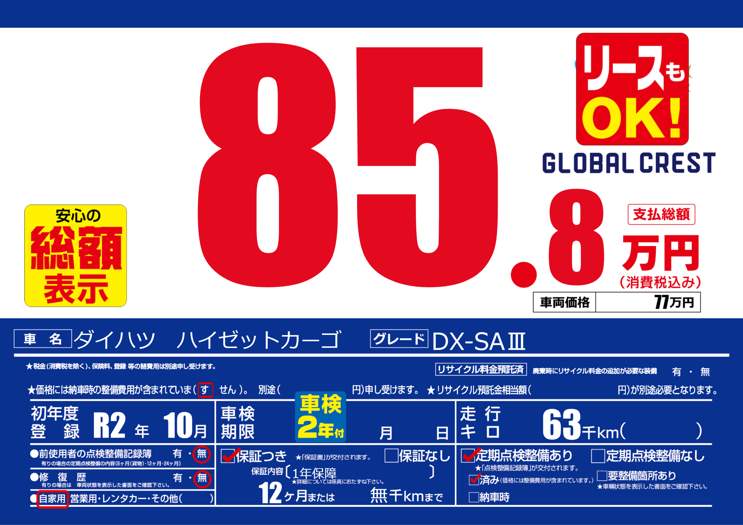 | 定期点検整備 | 定期点検整備あり 定期点検整備済み | ||