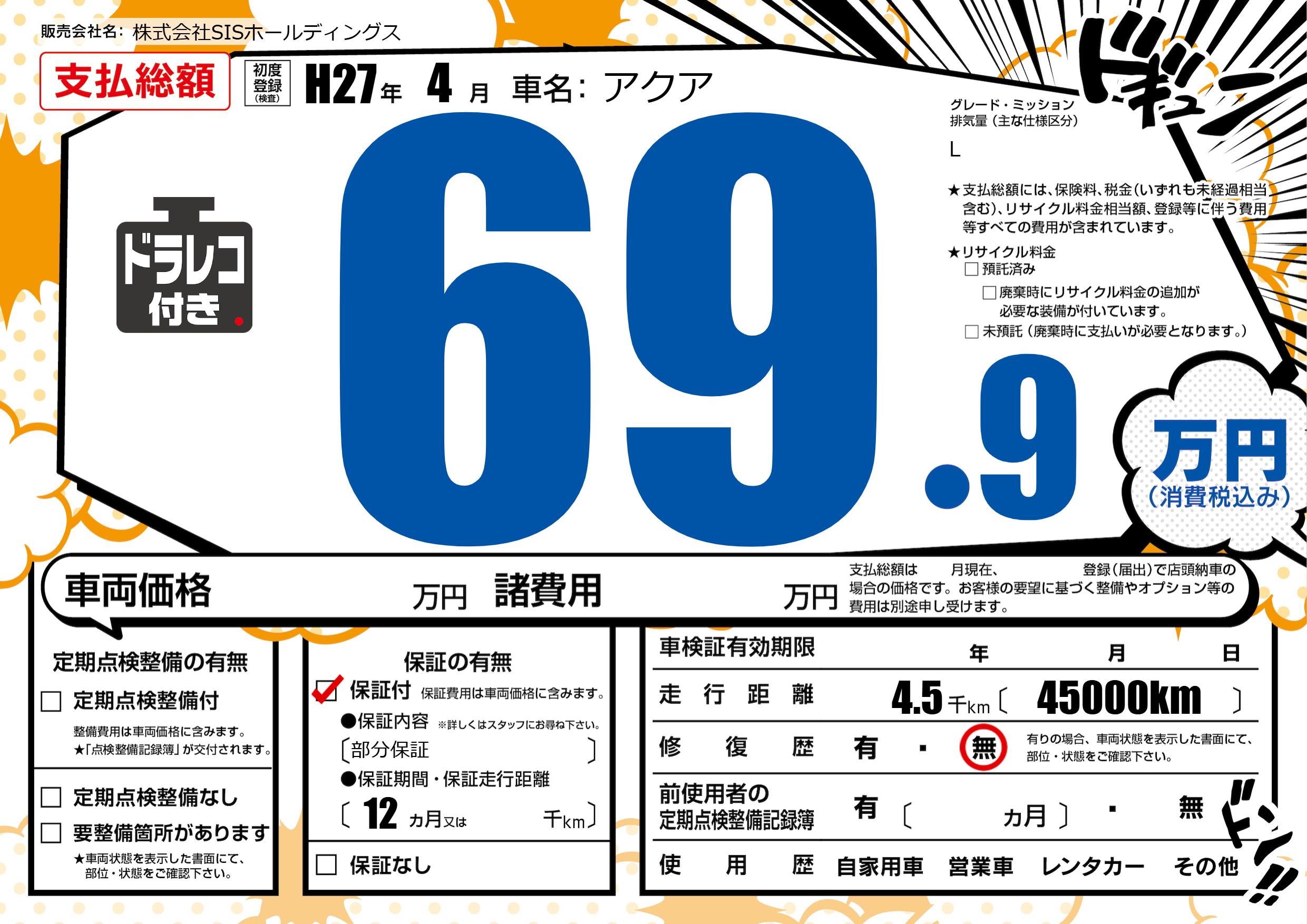 | 走行キロ | 0.4万km | 初年度登録 | H27年4月 |