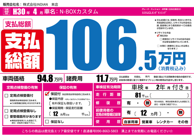 | 走行キロ | 6万km | 初年度登録 | H27年3月 |