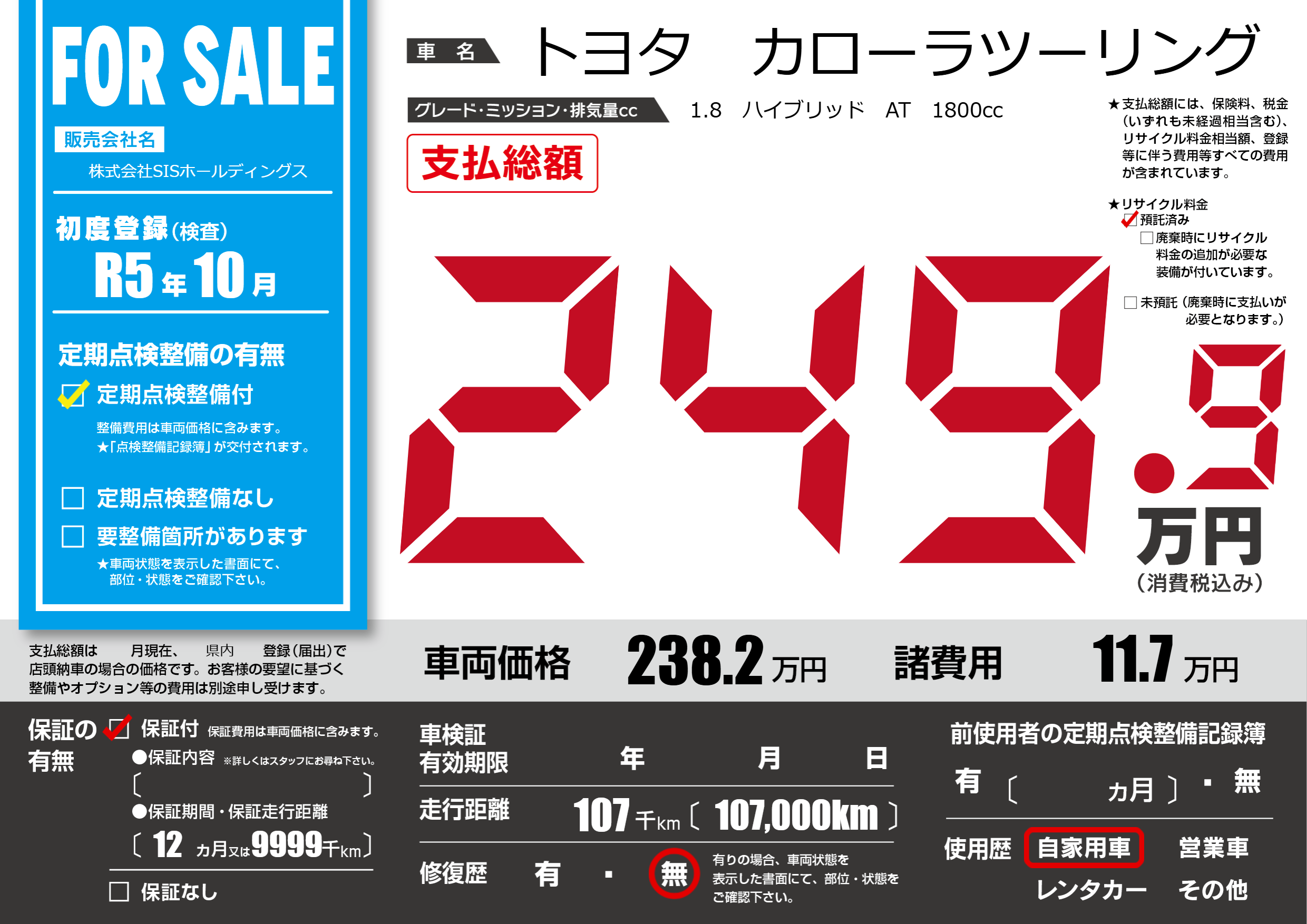 | 車名 | トヨタ カローラツーリング | グレード ミッション 排気量 |