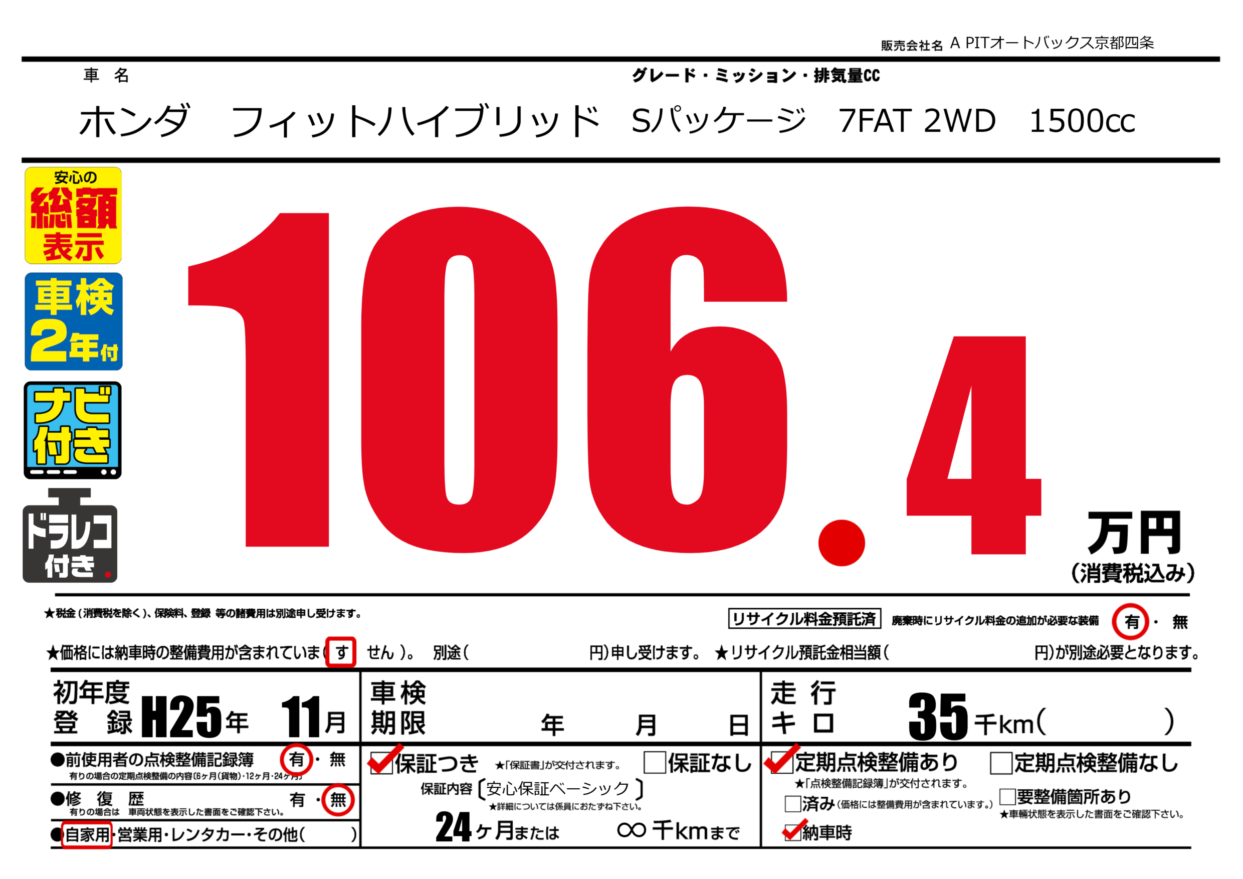 | 車名 | ホンダ フィットハイブリッド | グレード ミッション 排気量 |