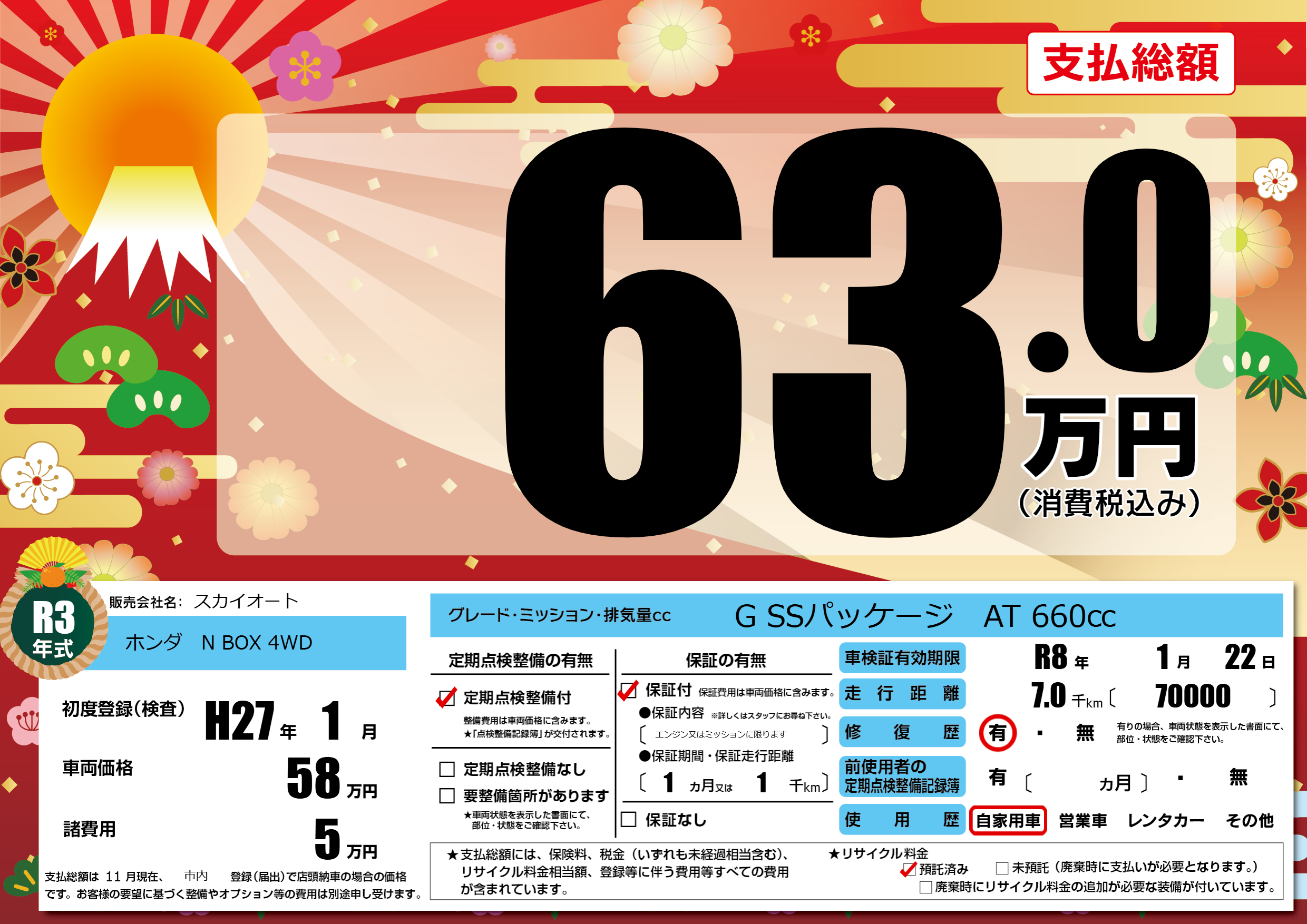 | 車名 | ホンダ N BOX 4WD | グレード ミッション 排気量 |