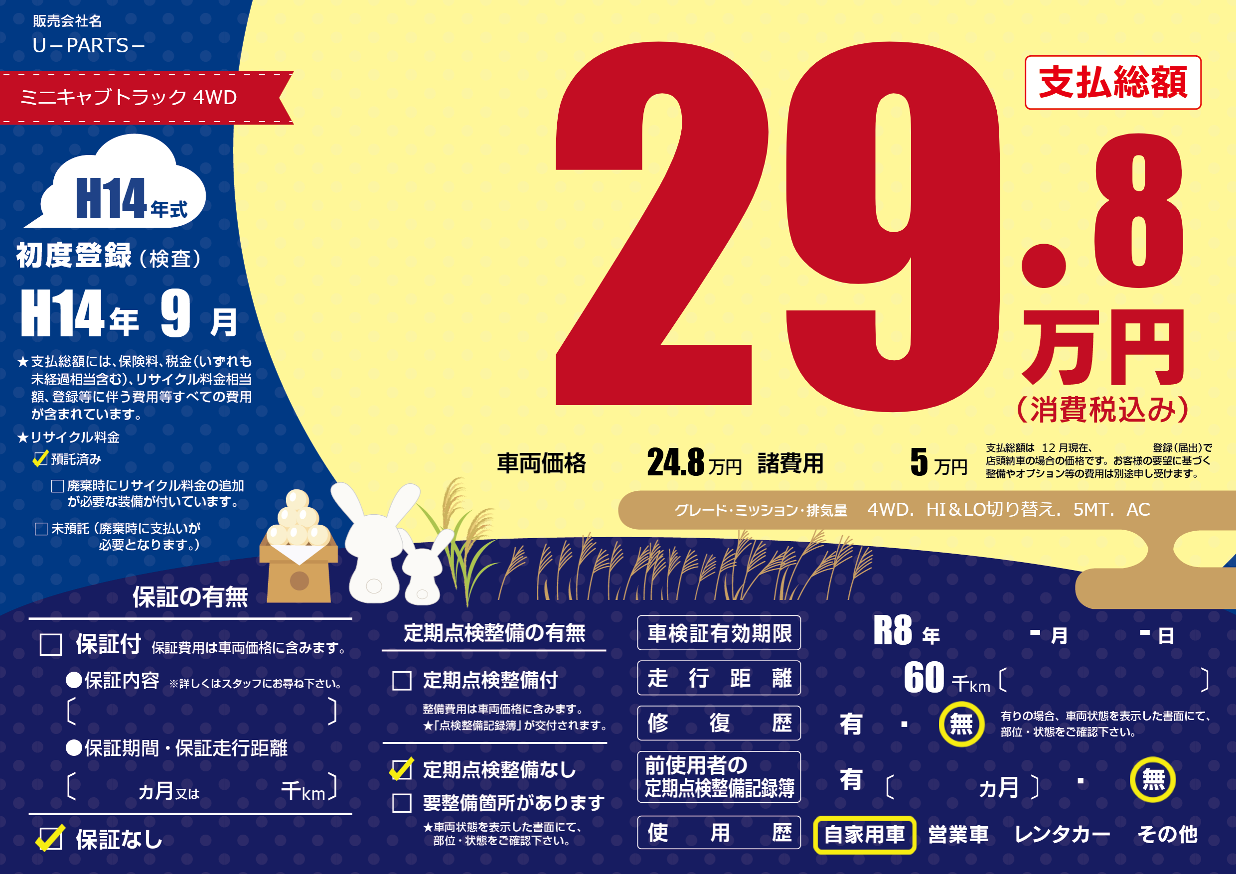 | 車名 | ミニキャブトラック 4WD | グレード ミッション 排気量 |