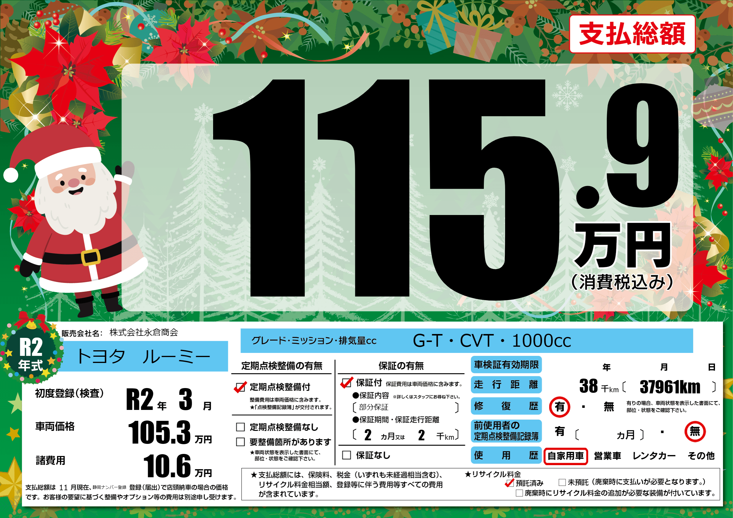 | 車名 | トヨタ ルーミー | グレード ミッション 排気量 |