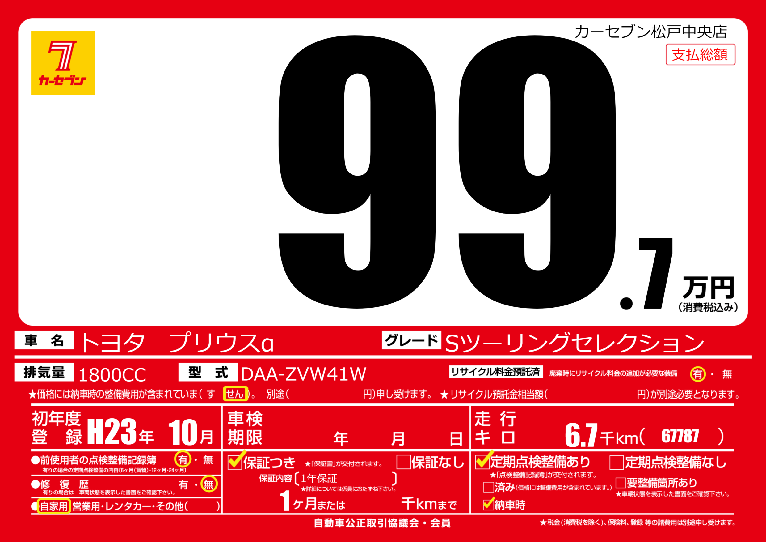 | 車名 | トヨタ プリウスα | グレード ミッション 排気量 |