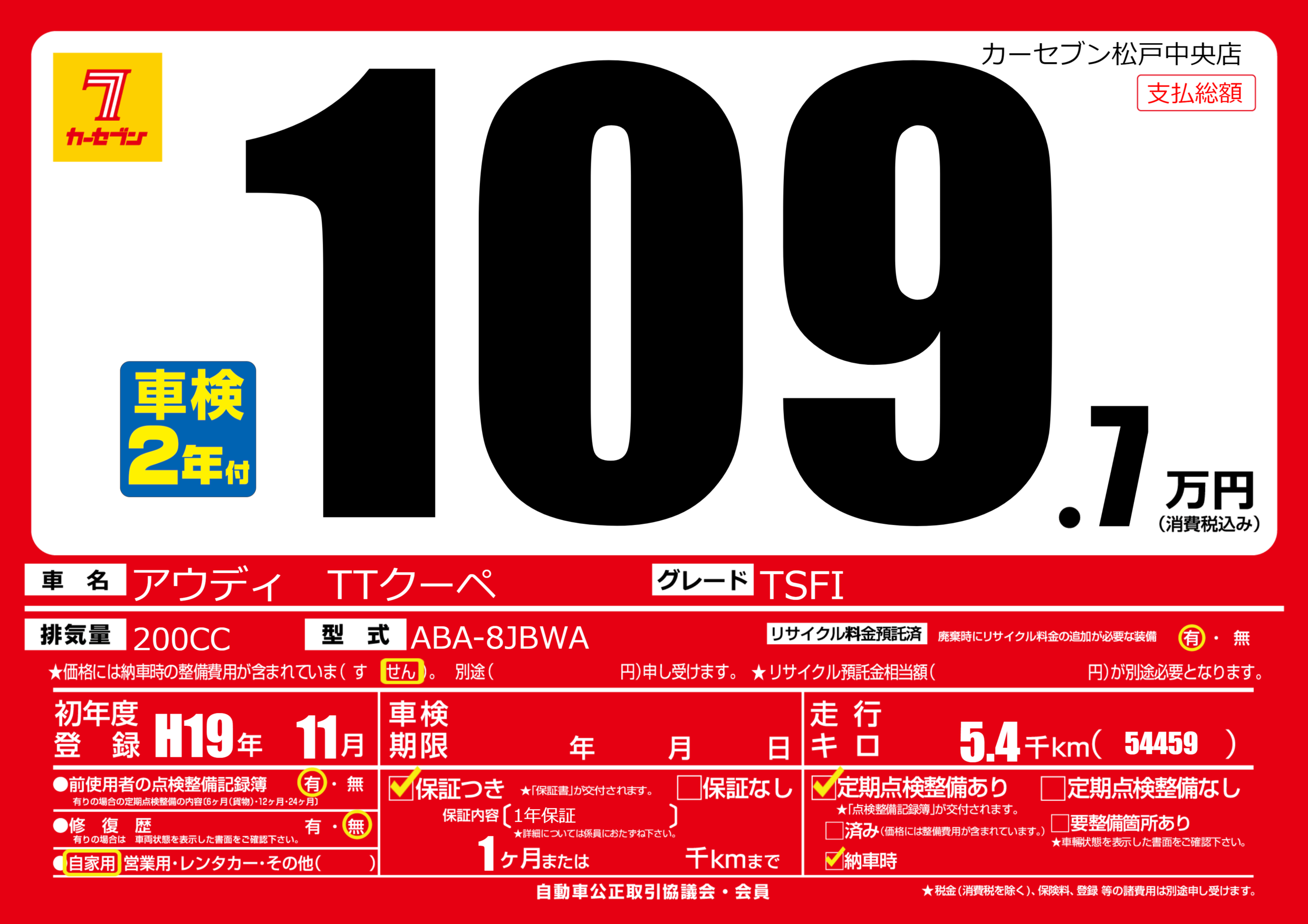 | 車名 | アウディ TTクーペ | グレード ミッション 排気量 |