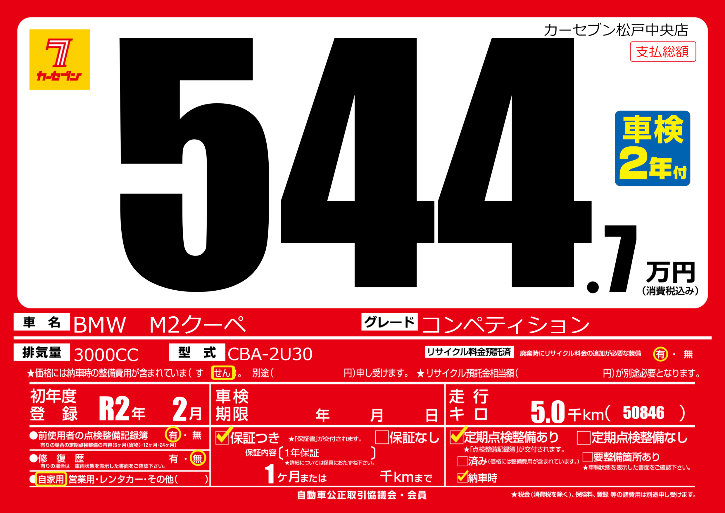 | 車名 | BMW M2クーペ | グレード ミッション 排気量 |