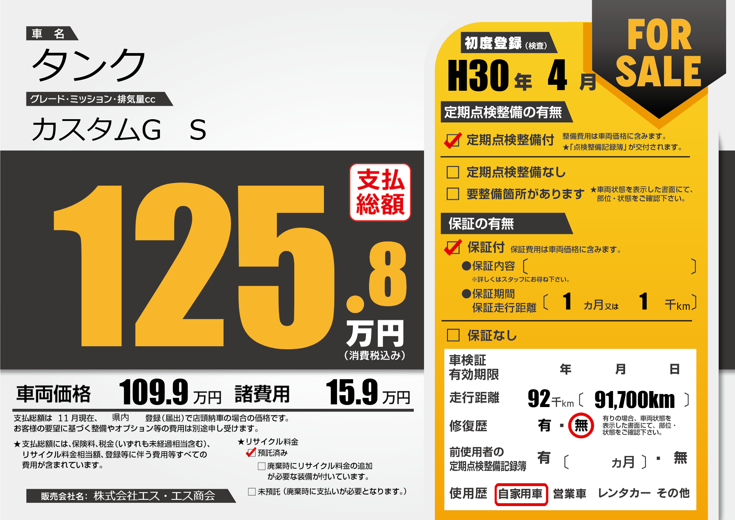 | 走行キロ | 9.2万km | 初年度登録 | H30年4月 |