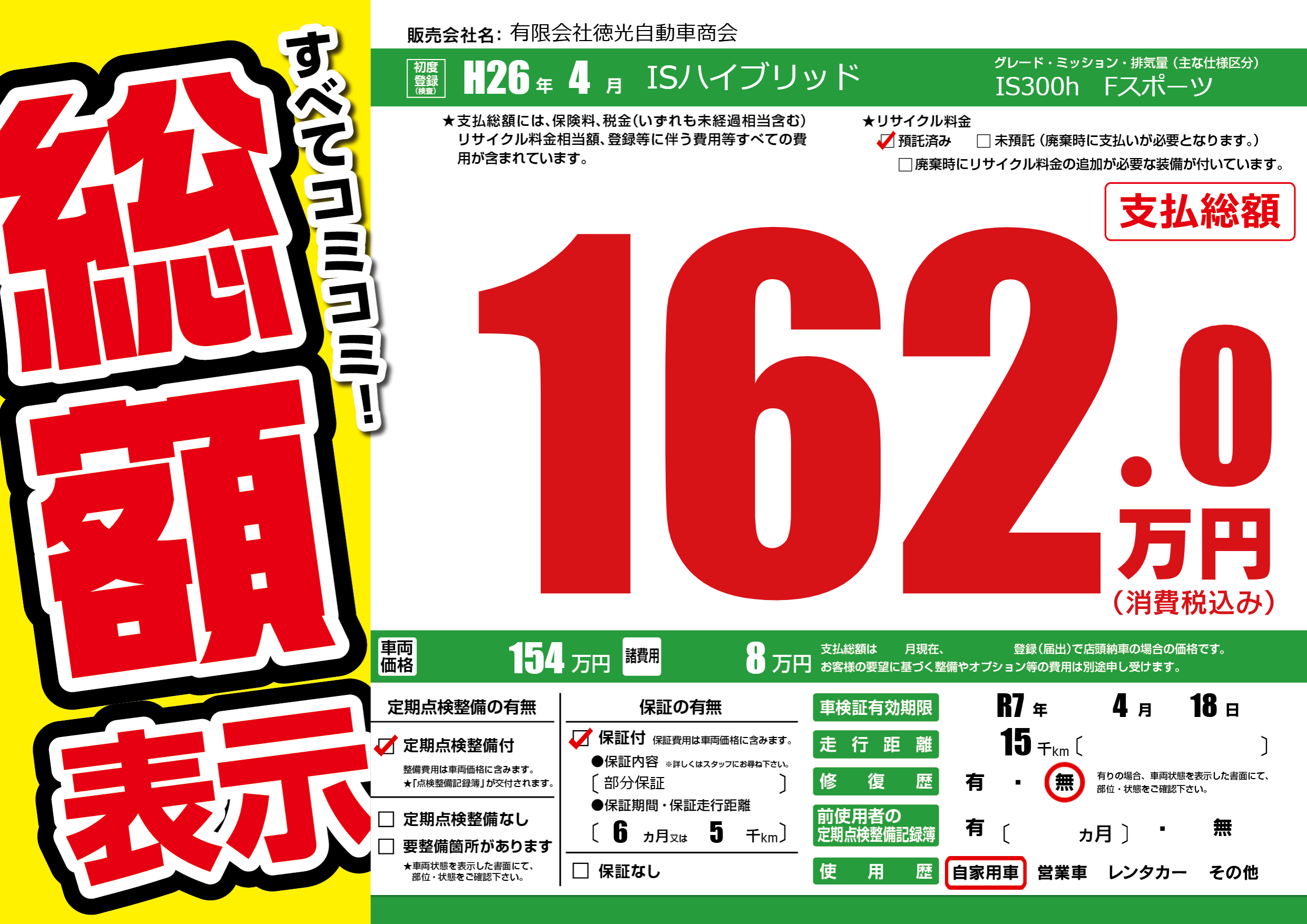 | 車名 | ISハイブリッド | グレード ミッション 排気量 |