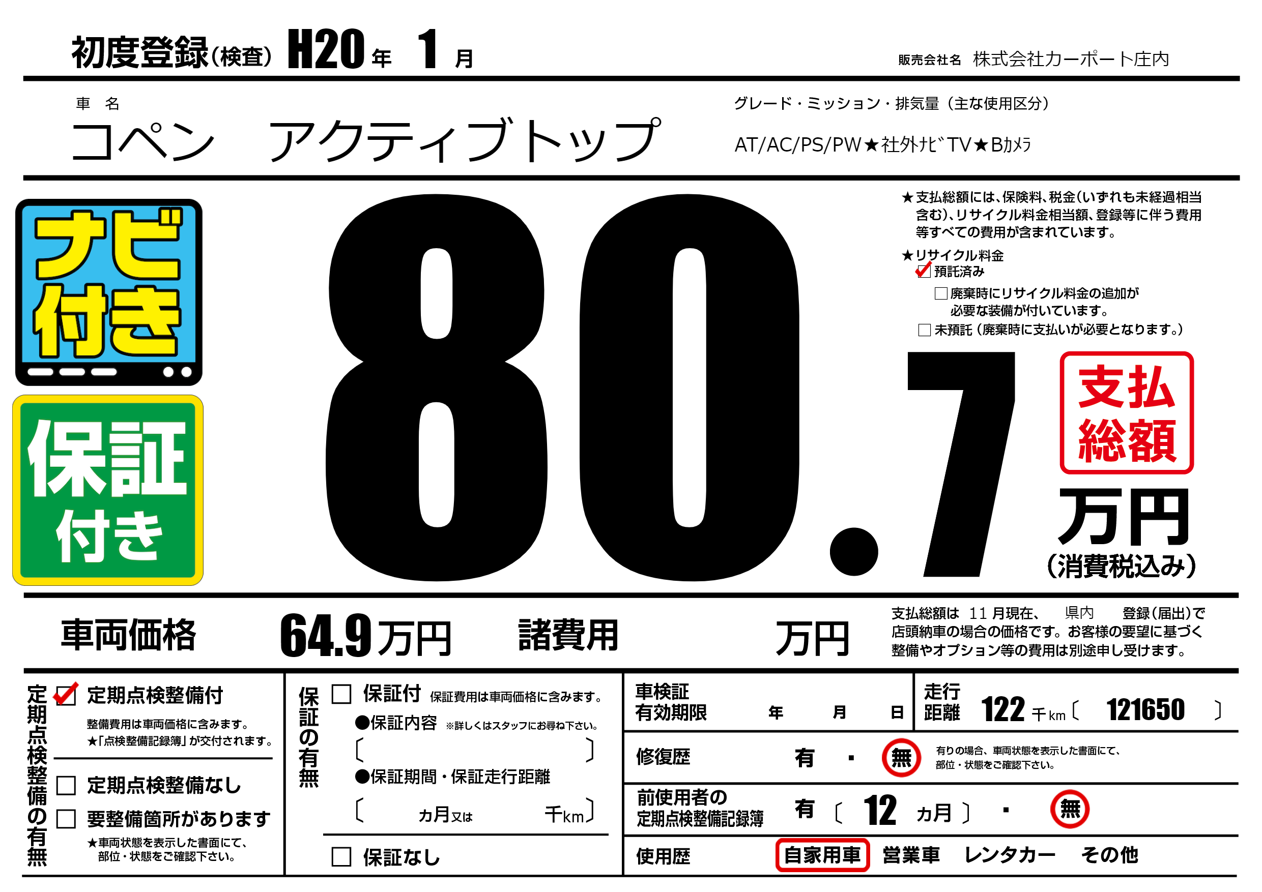 | 車名 | コペン アクティブトップ | グレード ミッション 排気量 |