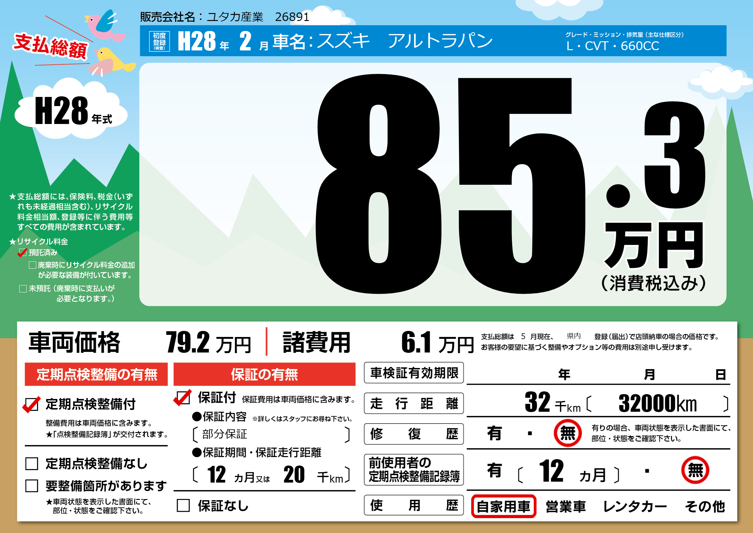 保証付き 保証内容(部分保証) 12ヶ月または(20)千kmまで |