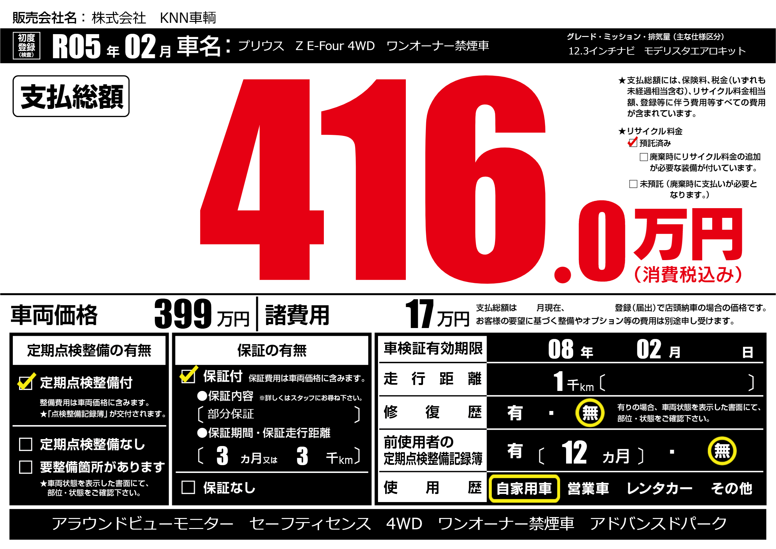 | 車名 | プリウス Z E-Four 4WD ワンオーナー禁煙車 | グレード ミッション 排気量 |