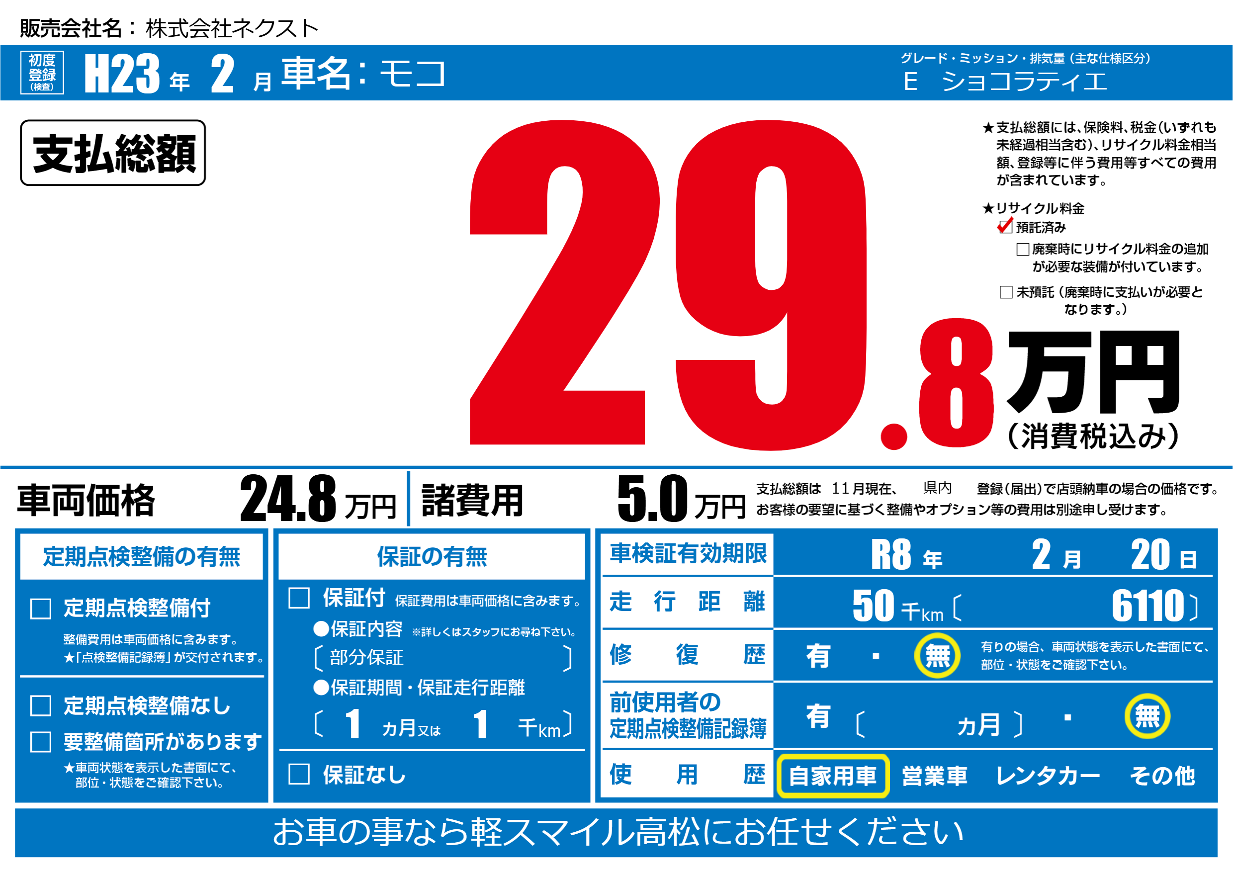 | 走行キロ | 5万km | 初年度登録 | H23年2月 |