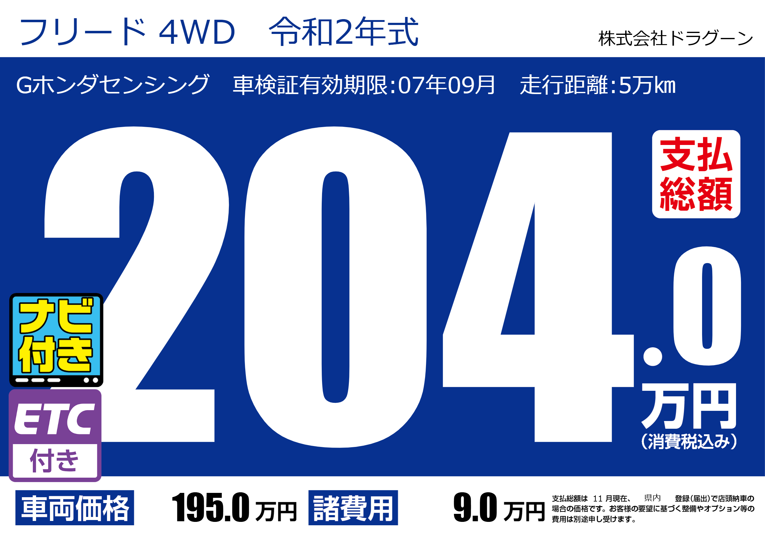 | 車名 | フリード 4WD 令和2年式 | グレード ミッション 排気量 |