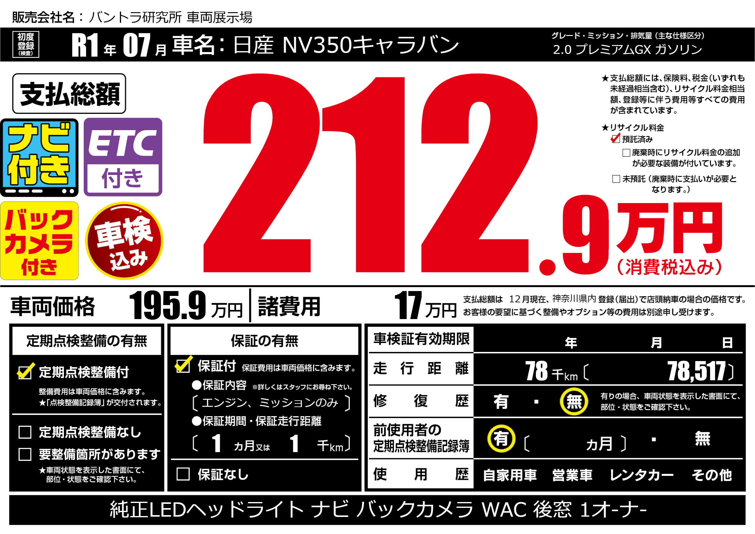 | 走行キロ | 7.8万km | 初年度登録 | R1年07月 |