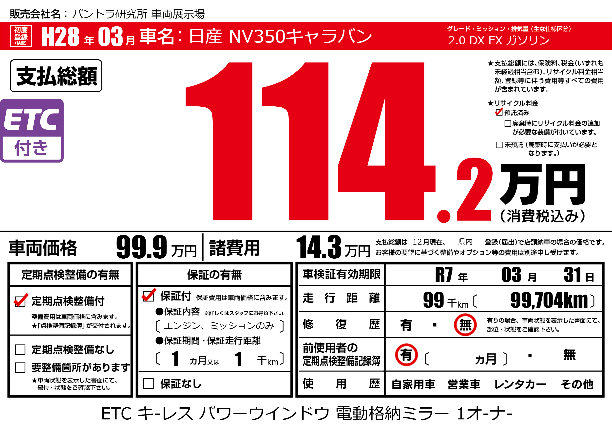 | 車名 | 日産 NV350キャラバン | グレード ミッション 排気量 |