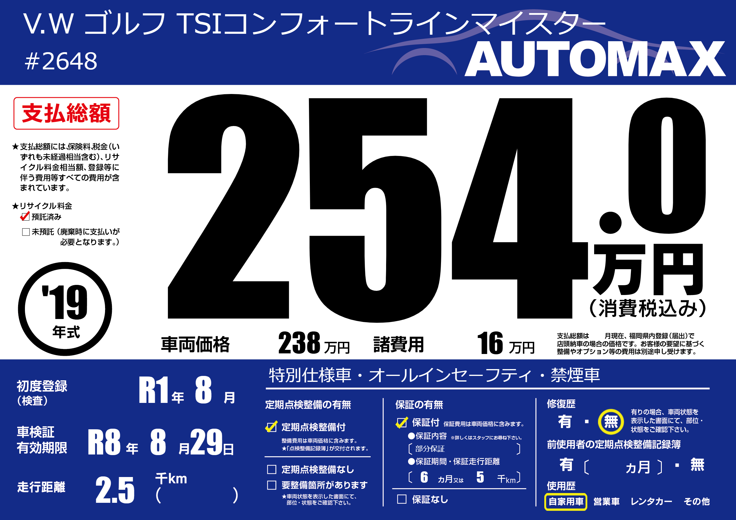 | 走行キロ | 0.2万km | 初年度登録 | R1年8月 |