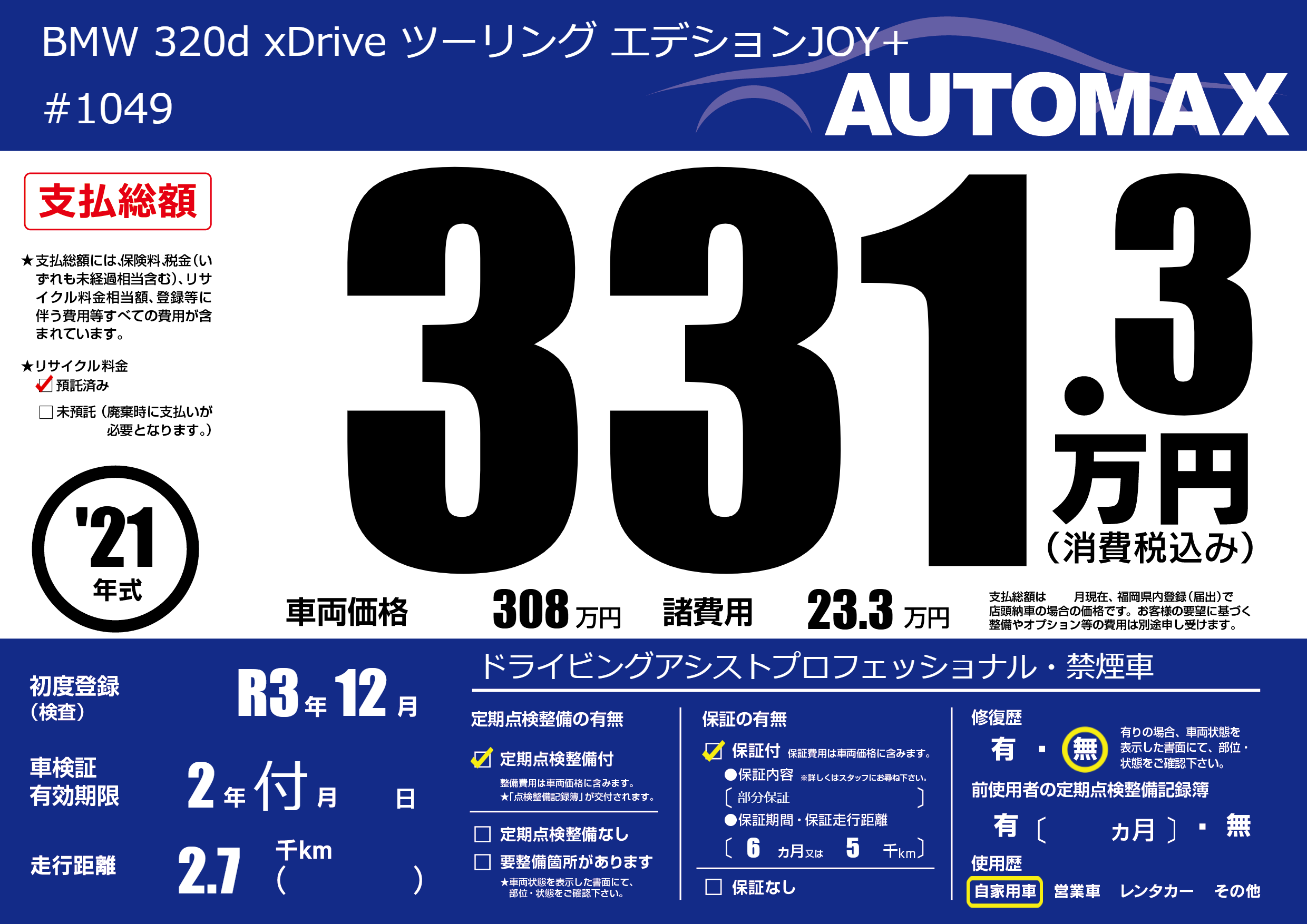 | 車名 | BMW 320d xDrive ツーリング エデションJOY+ | グレード ミッション 排気量 |