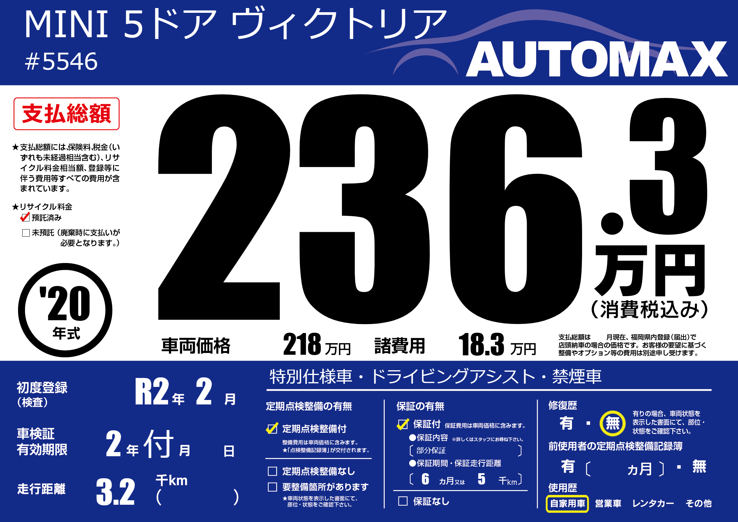 | 車名 | MINI 5ドア ヴィクトリア | グレード ミッション 排気量 |