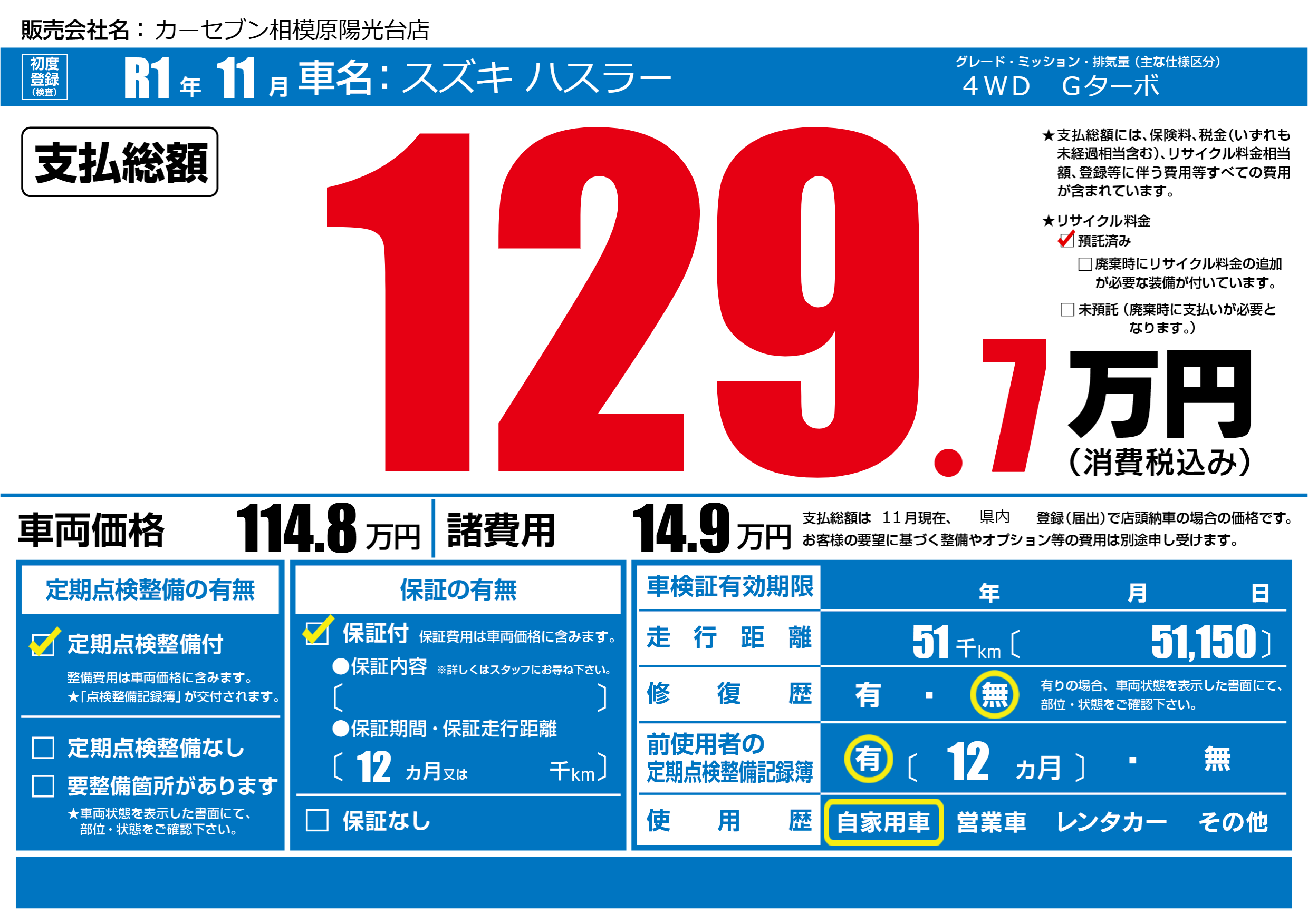 | 車名 | スズキ ハスラー | グレード ミッション 排気量 |