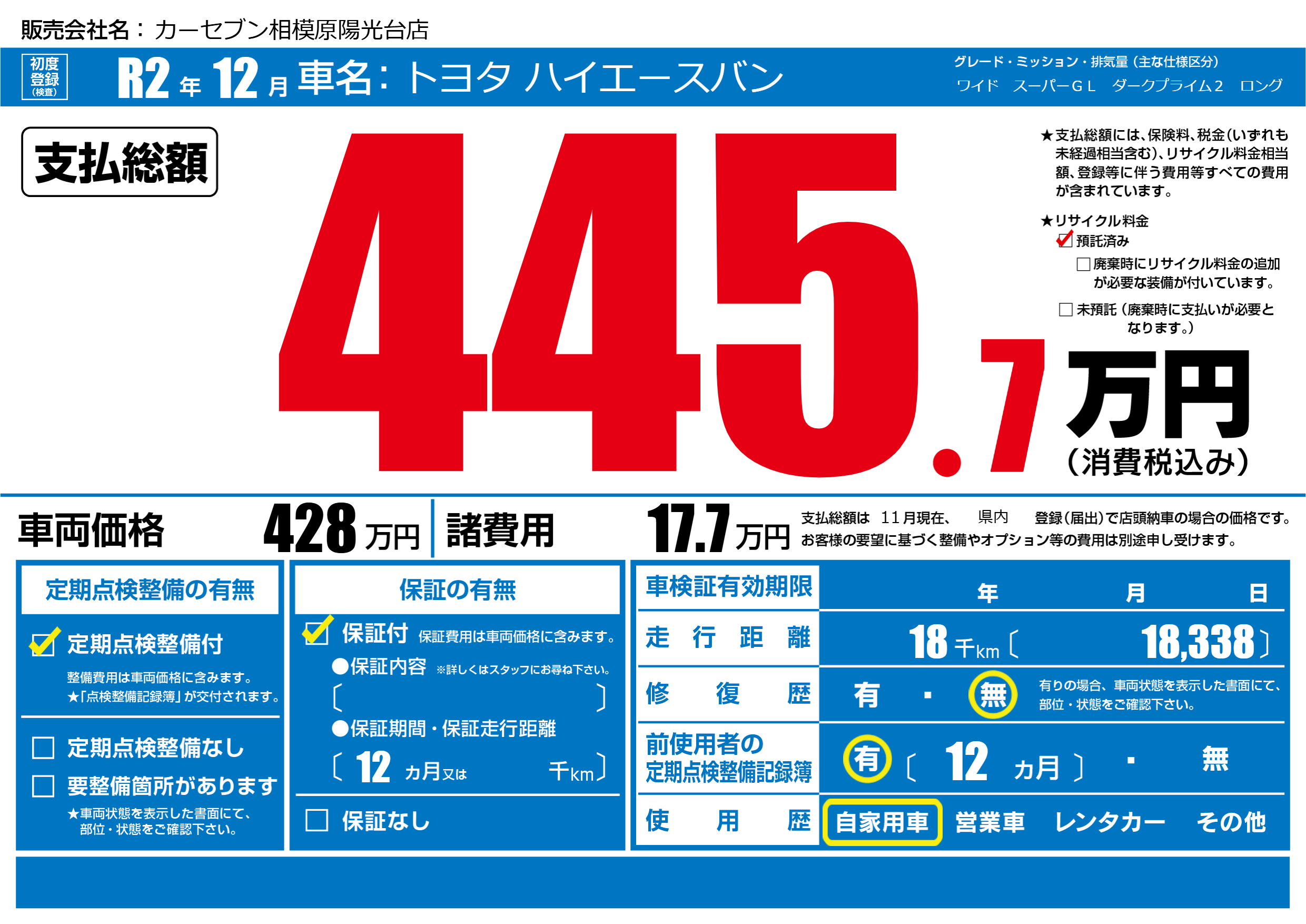 | 走行キロ | 1.8万km | 初年度登録 | R2年12月 |