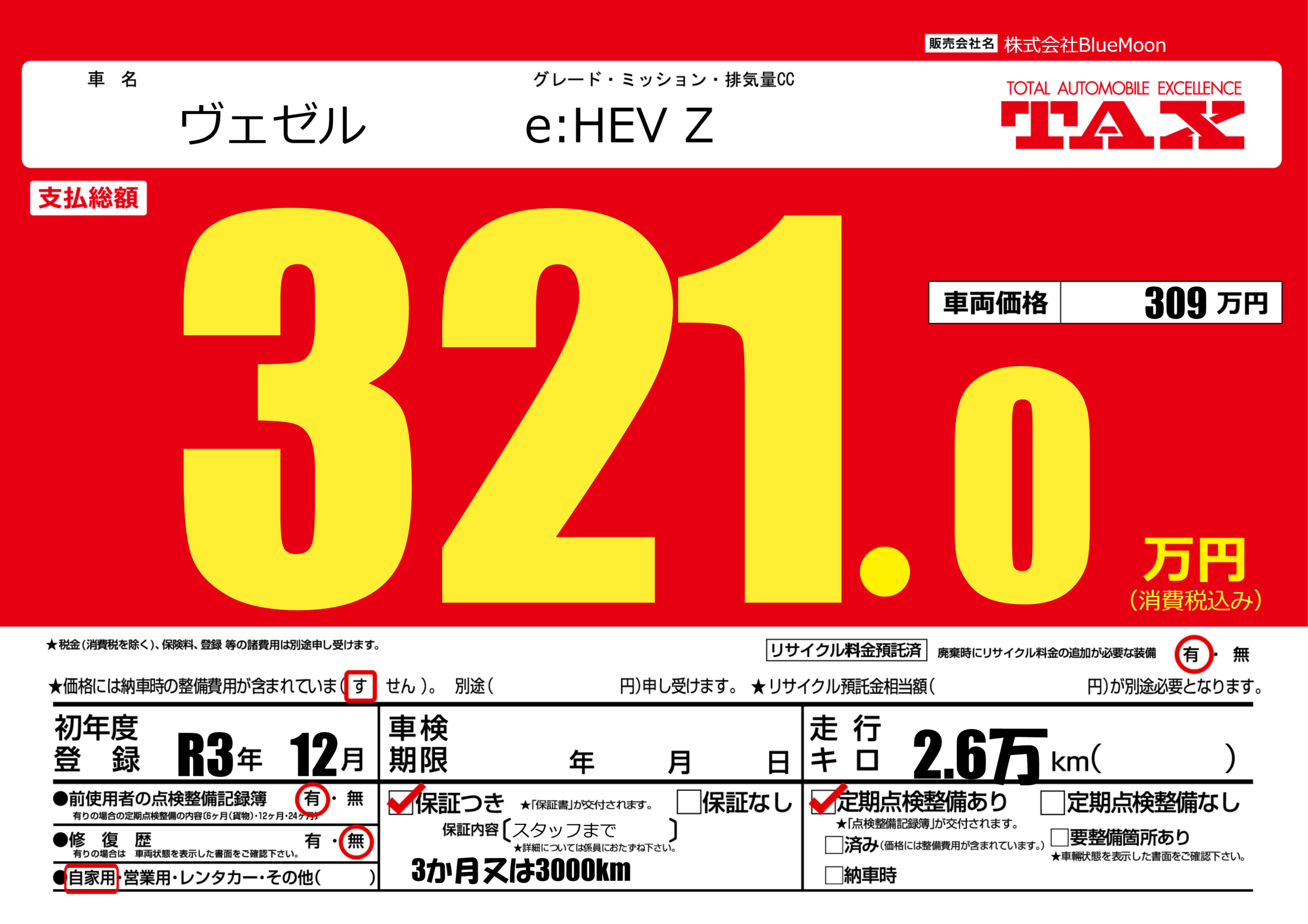 | 車名 | ヴェゼル | グレード ミッション 排気量 |
