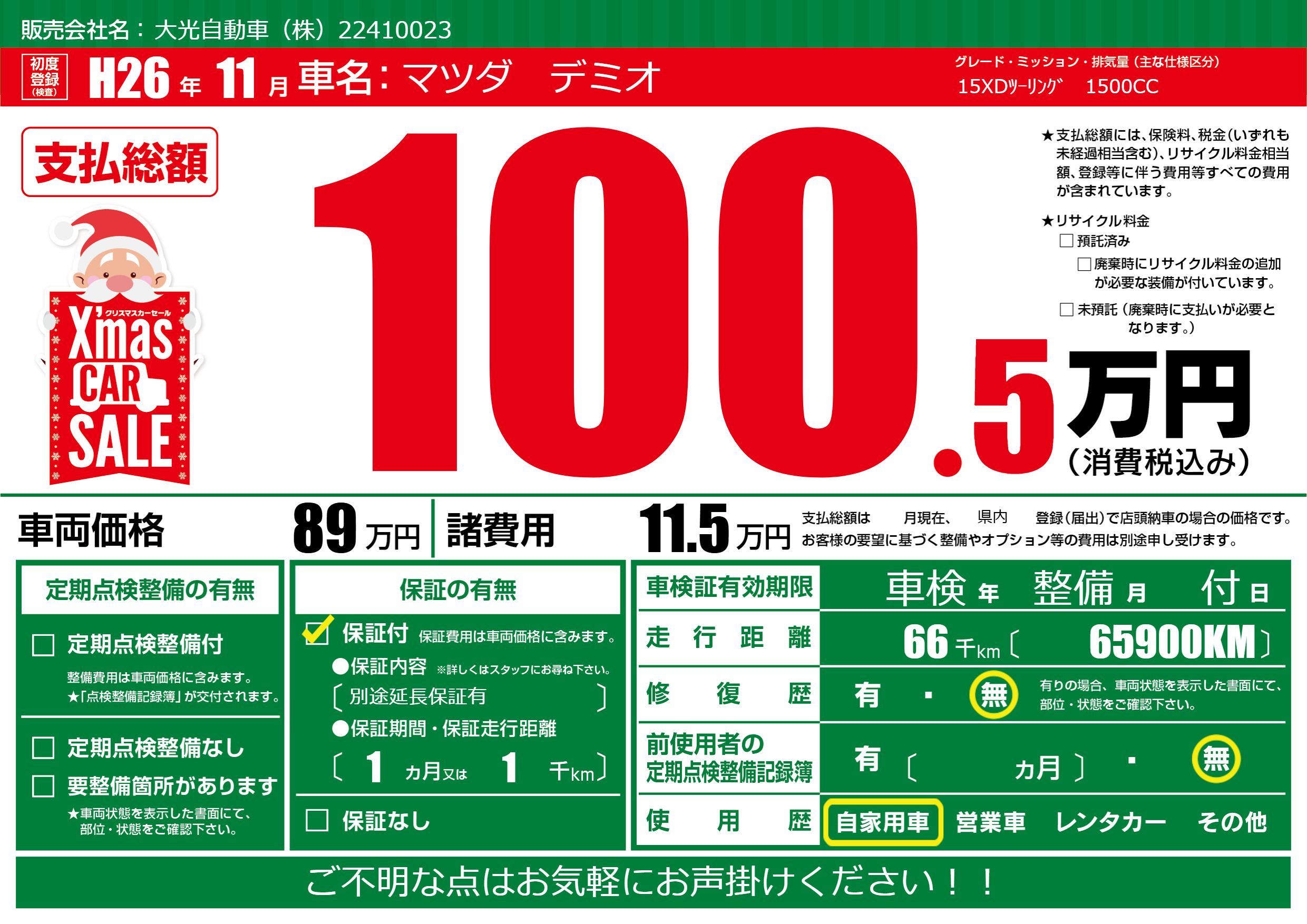 | 車名 | マツダ デミオ | グレード ミッション 排気量 |
