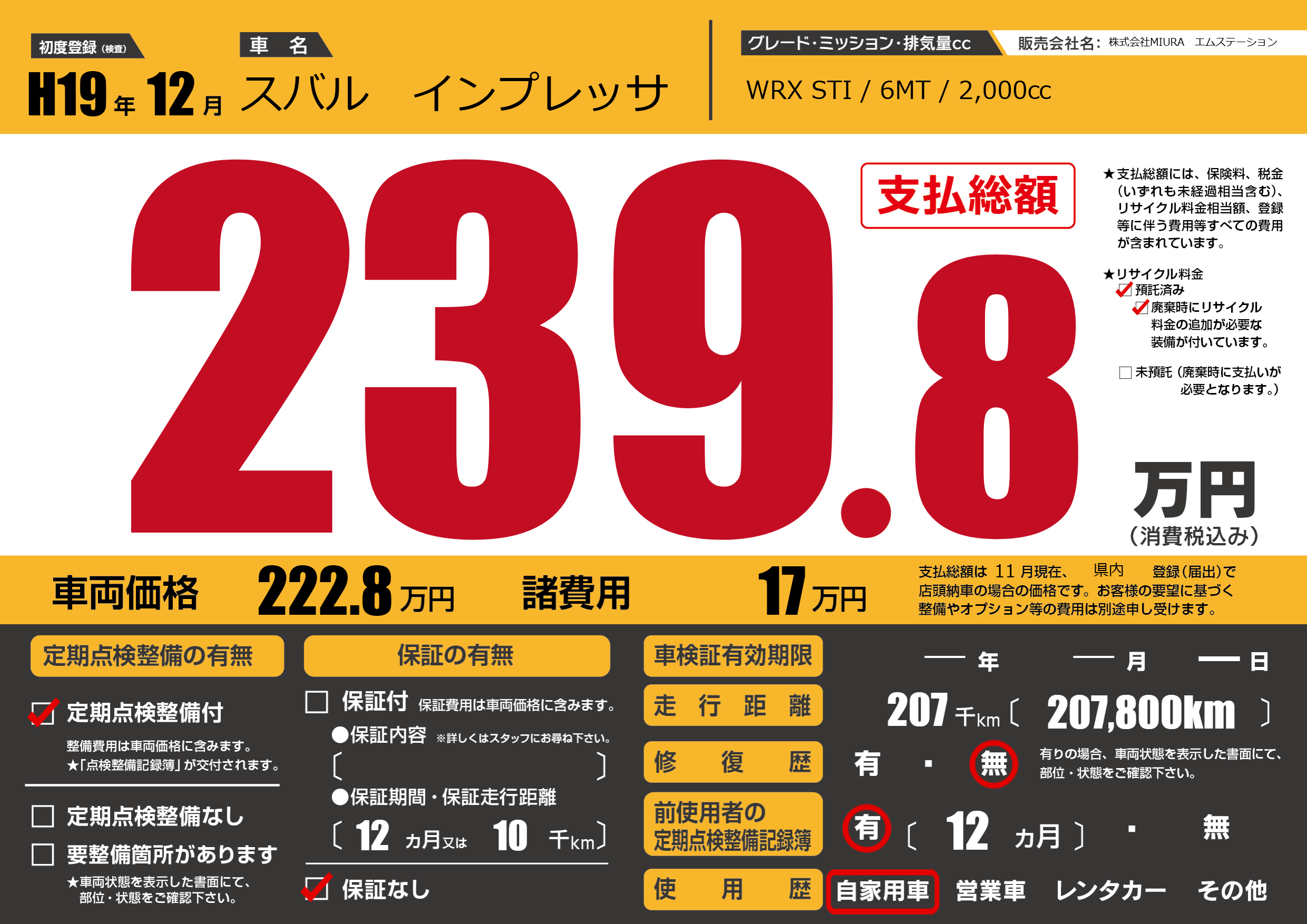 | 車名 | スバル インプレッサ | グレード ミッション 排気量 |