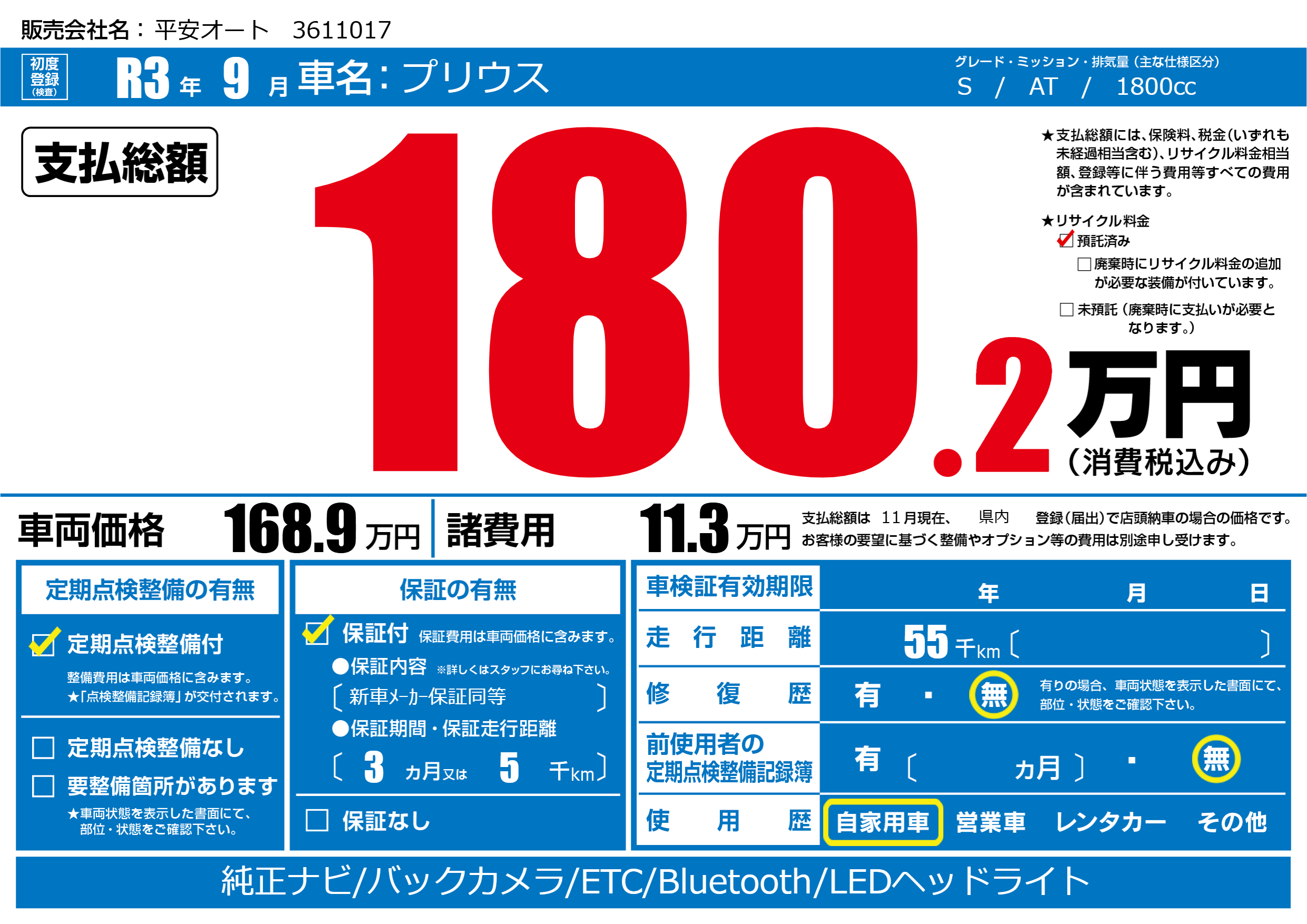 保証付き 保証内容(新車メーカー保証同等) 3ヶ月または(5)千kmまで |